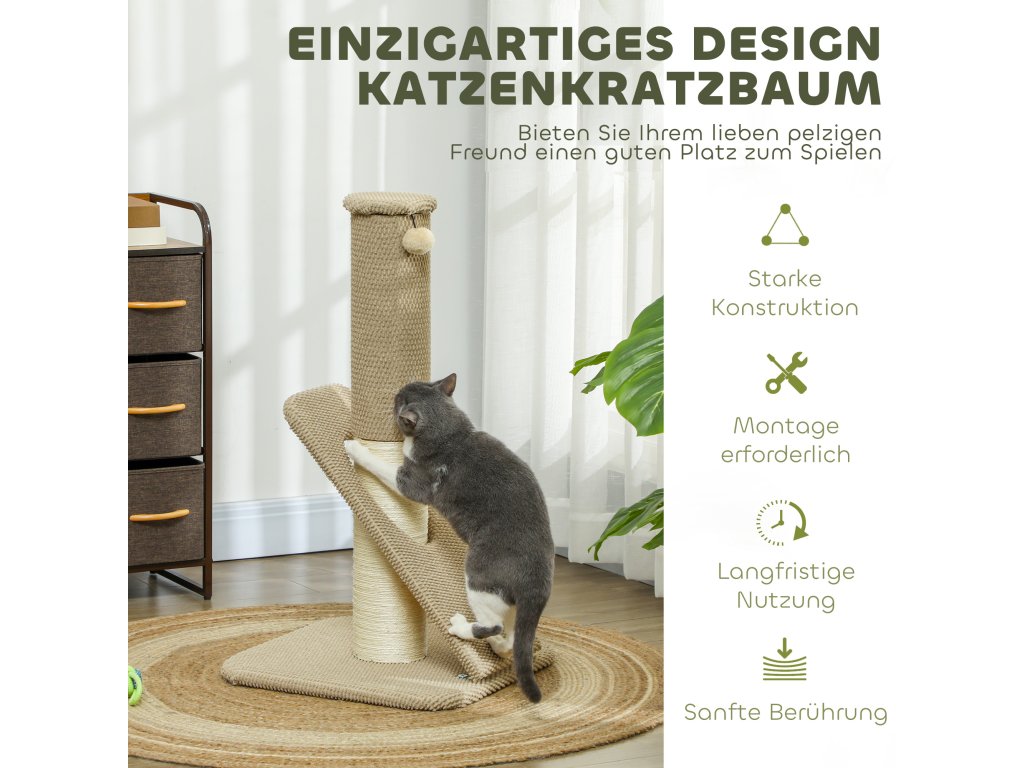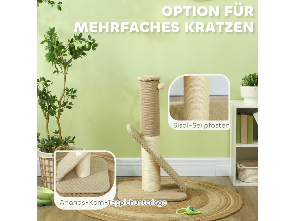 Škrabadlo PawHut pro kočky, s podložkou, sloupkem a míčkem na hraní, koberec a sisal, 84 cm, světle hnědá barva