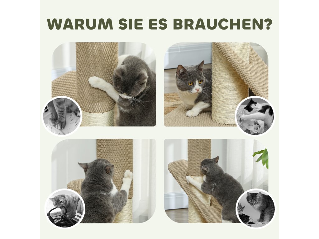 - Všestranné možnosti škrábání: Vaše kočka může škrábat jak na sisalem omotaném kmeni, tak na šikmé ploše pokryté kolíky. Tyto různé povrchy škrabadla poskytují rozmanitost a udržují vaši kočku aktivní a šťastnou