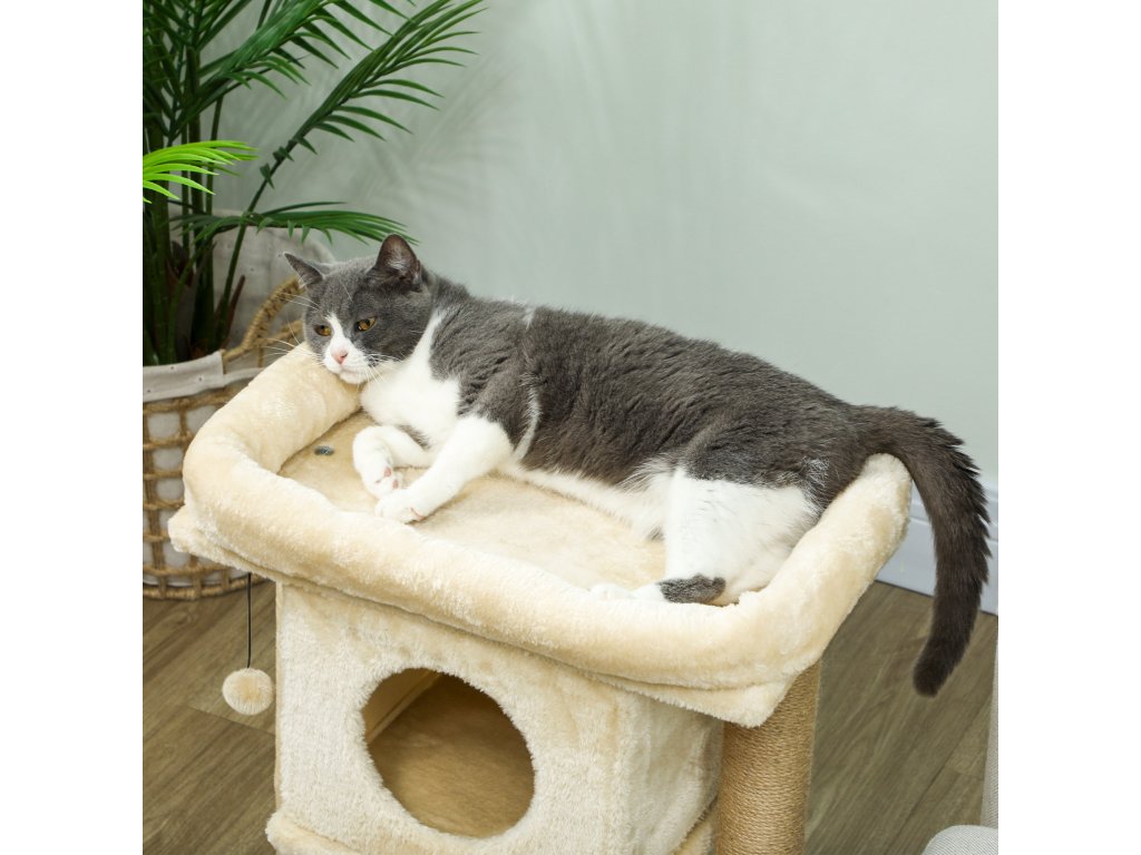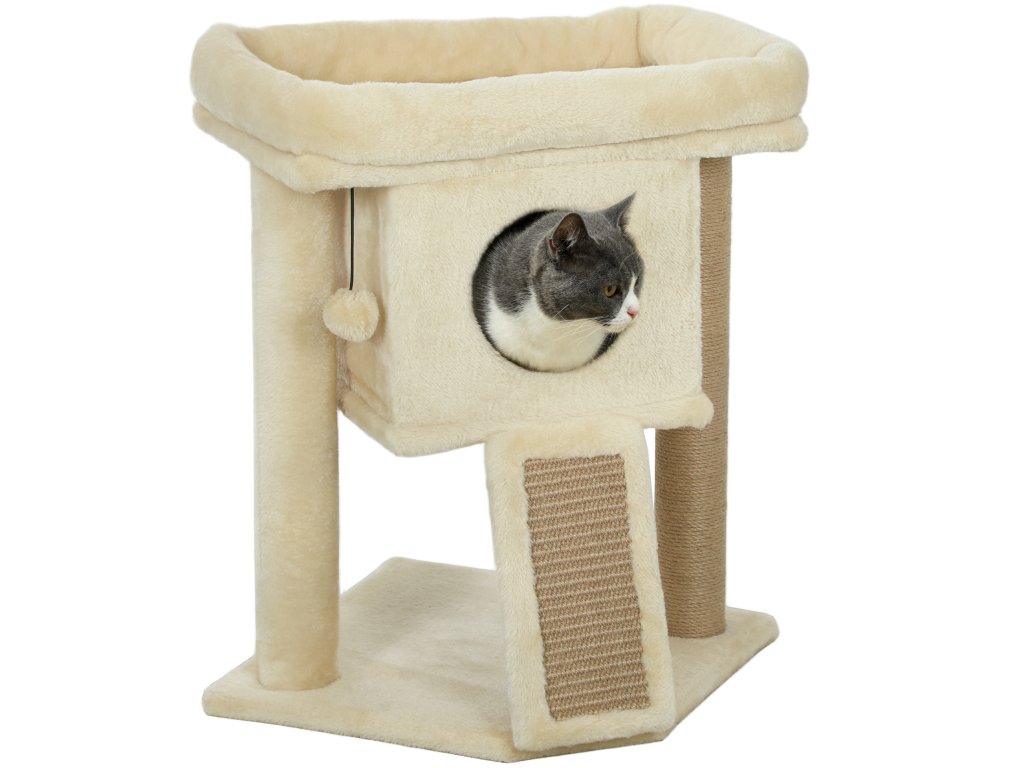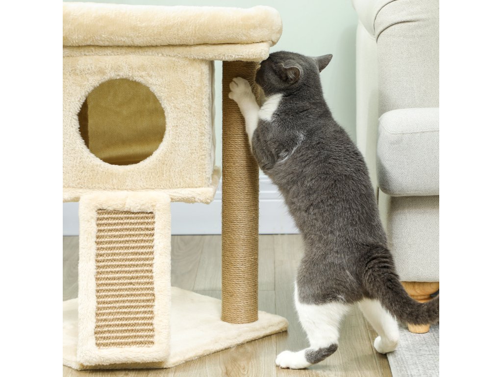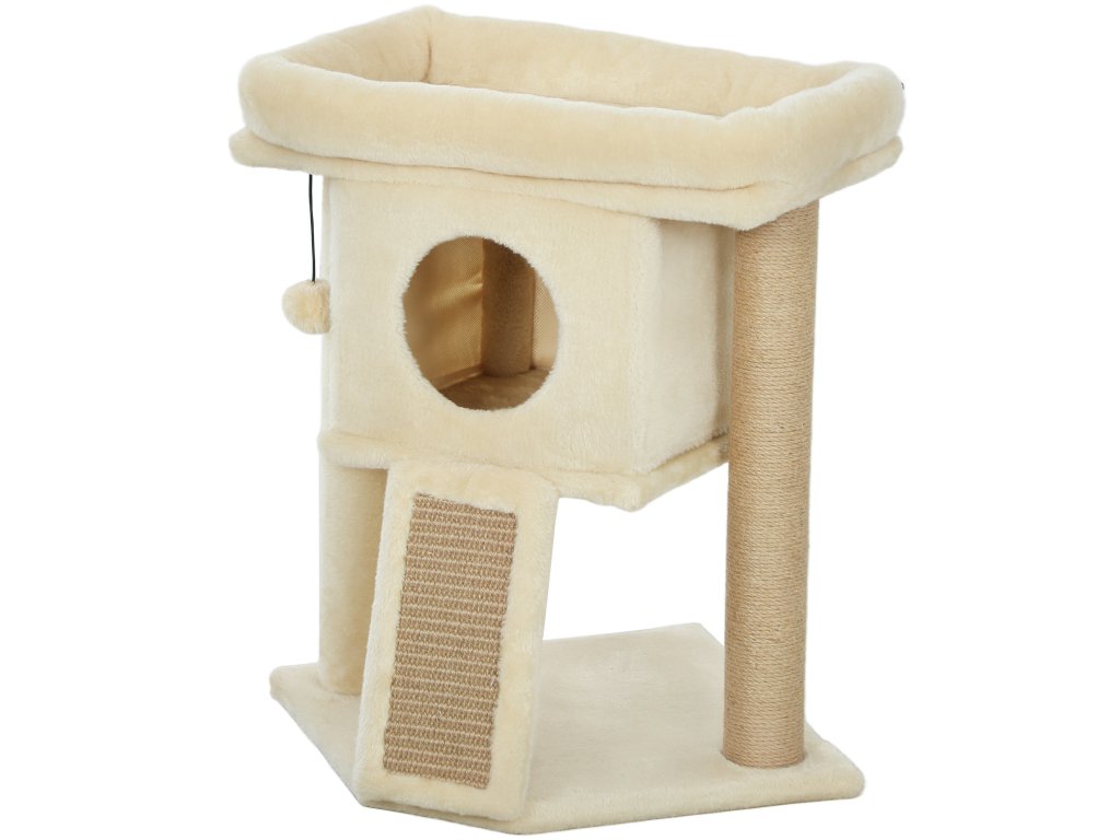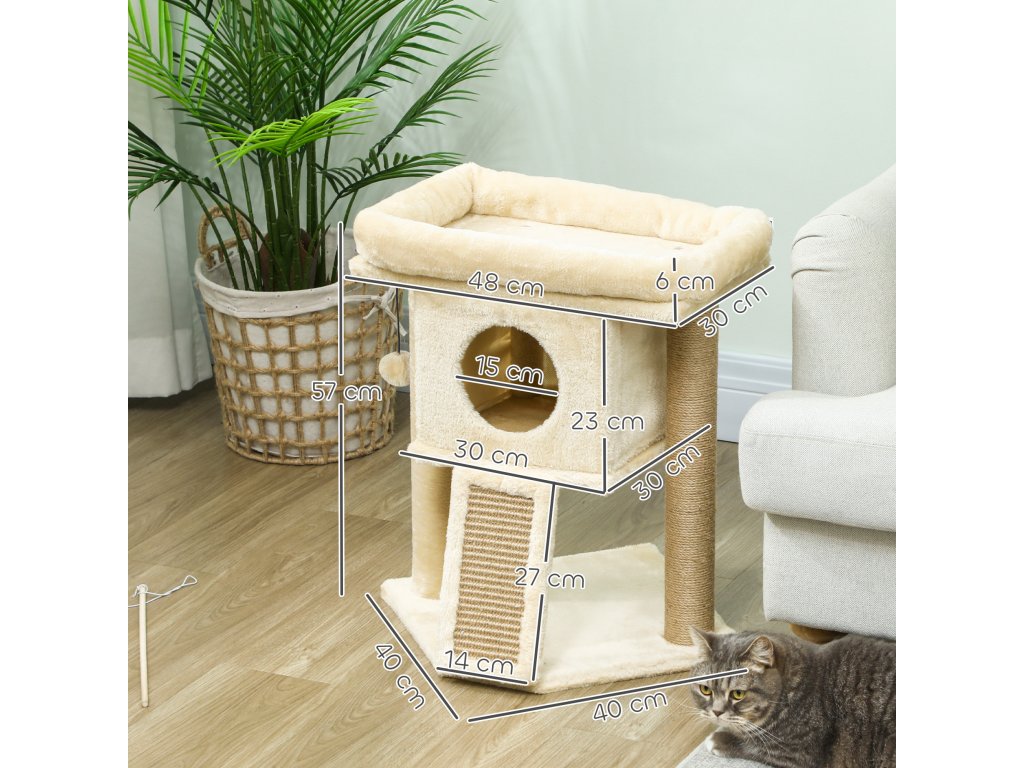 Škrabadlo PawHut s jutovou škrabací podložkou, plošinou na ležení, míčkem na hraní, domeček pro kočky, béžová barva, 40 x 40 x 57 cm