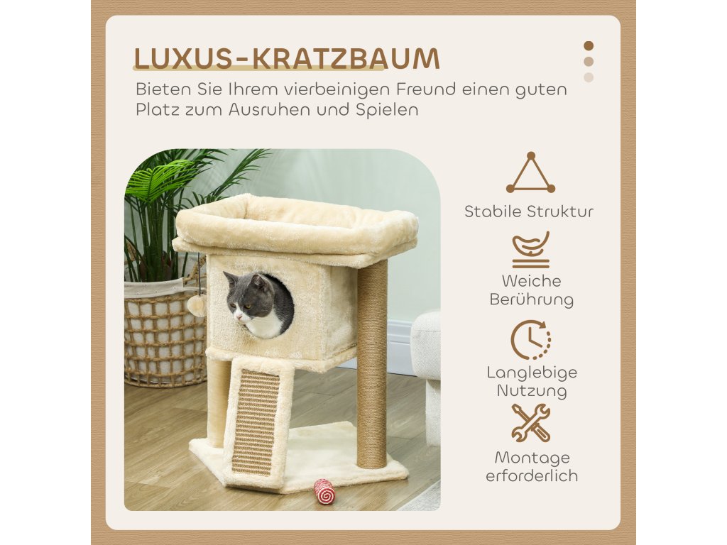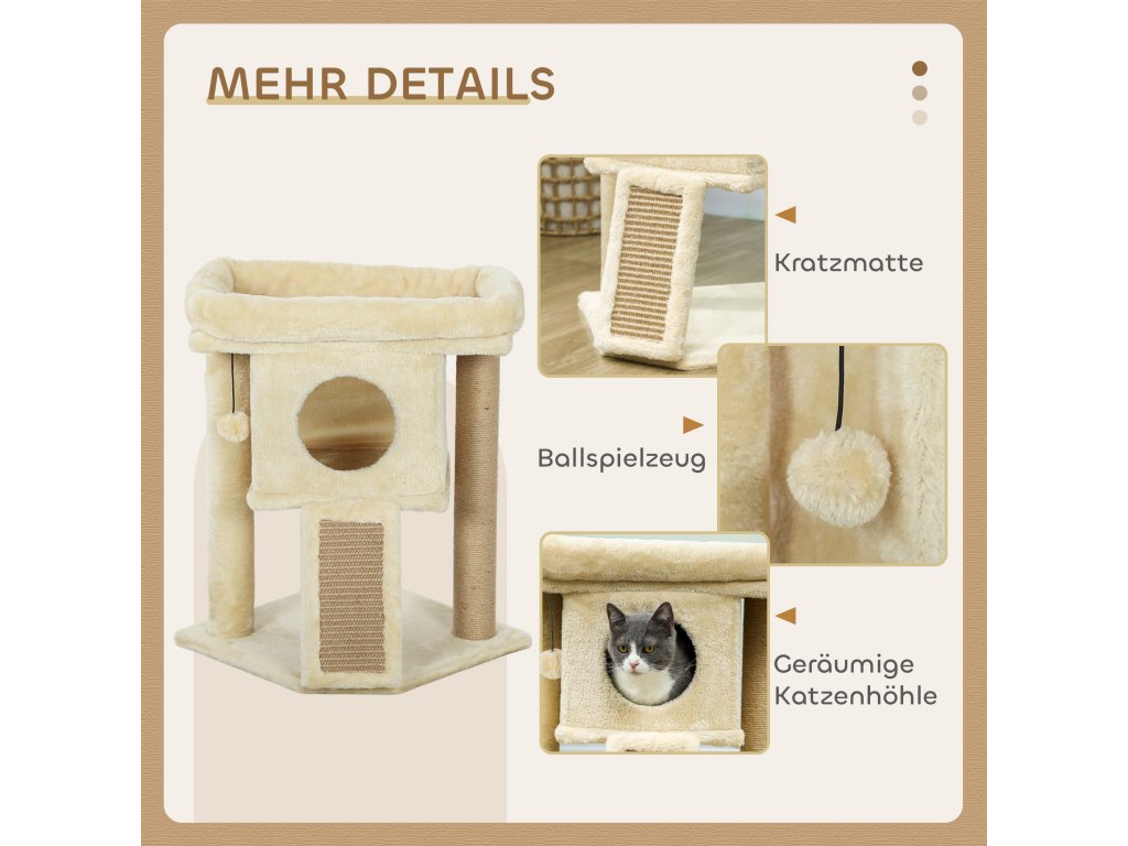 - Vše v jednom: Tento kočičí strom je škrabadlo, hrací plocha a místo na spaní v jednom. Škrabací podložka, plošina, domeček a hrací míč poskytují dostatek rozmanitosti.