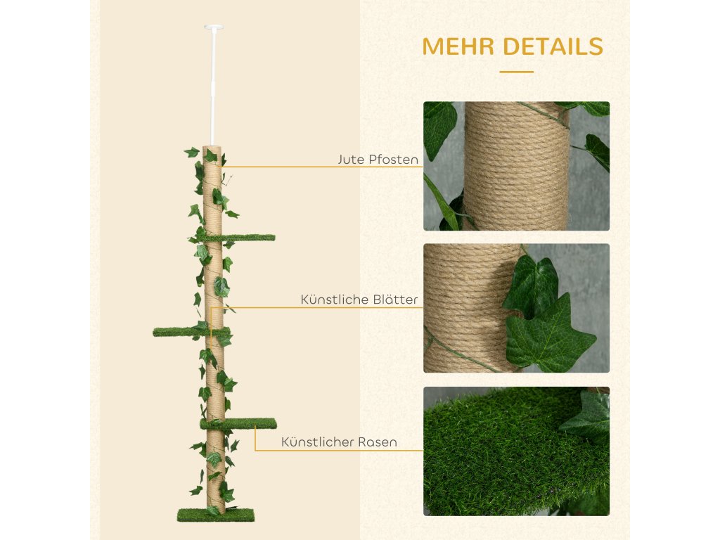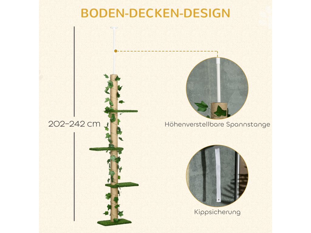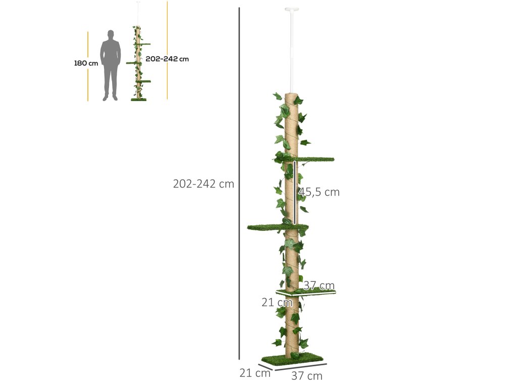 - Od podlahy ke stropu: Vysoký kočičí strom, který se pohybuje mezi 202 a 242 cm. Po utažení napínací tyče zůstává robustní a stabilní.