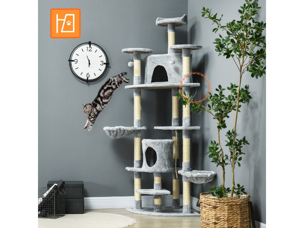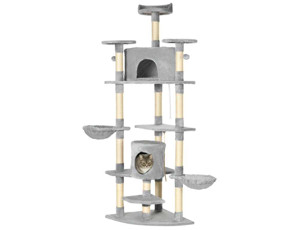 Škrabadlo PawHut se 2 houpacími sítěmi a 2 jeskyněmi pro kočky včetně hraček z plyše a sisalového lana světle šedá