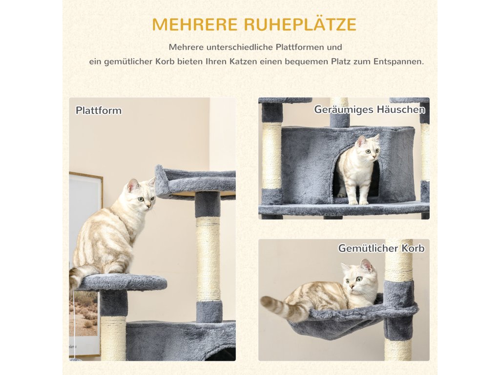 - konstrukce 2 v 1: Škrabadlo má nejen tři škrabadla, ale také dvě kočičí jeskyně a dvě houpací sítě, kde může vaše kočka spát a podřimovat. Několik plošin nabízí vaší kočce spoustu příležitostí ke hře, skákání a dovádění.