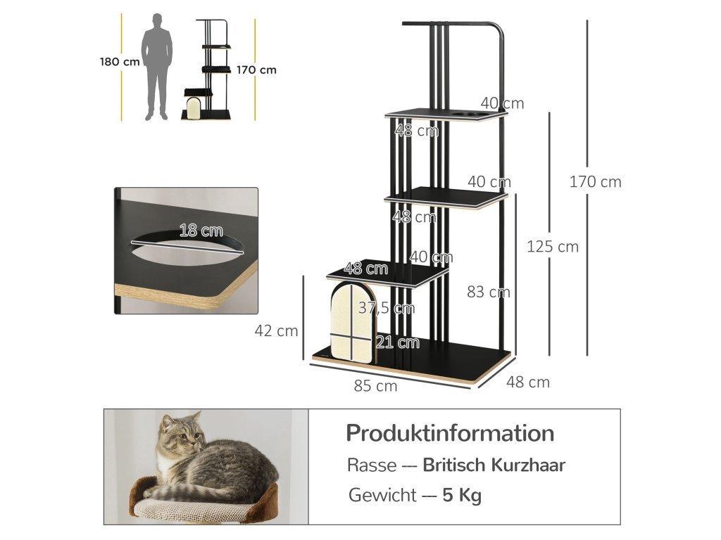Specifikace produktu: Celkové rozměry: 85D x 48Š x 170V cm. Škrabadlo: 21Š x 37,5V cm. Vhodné pro dvě kočky do 5 kg. Nutná montáž.
