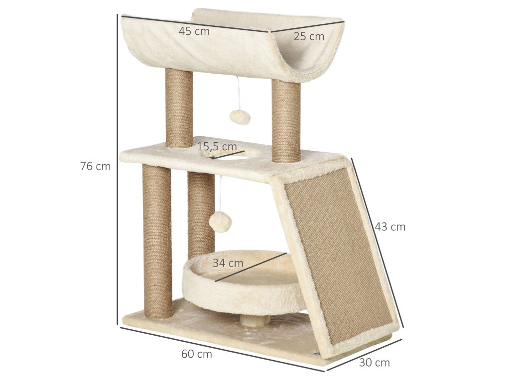 Rozměry: 60L x 30W x 76V cm. Postel: Ø34 x 7H cm. Sedák ve tvaru U: 45L x 25W x 12,5V cm. Vhodné pro kočky do 5 kg. Nutná montáž