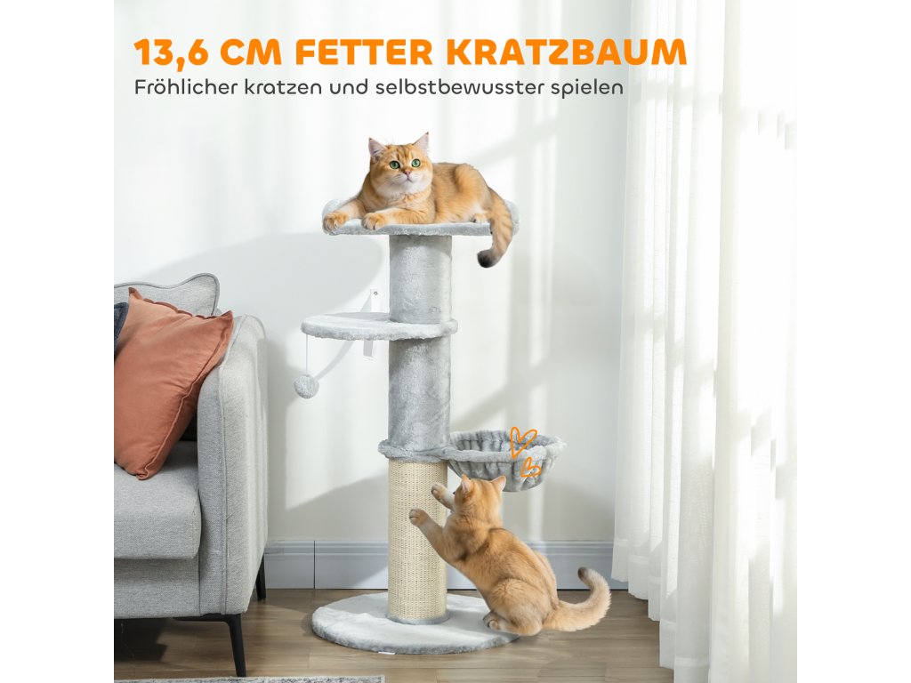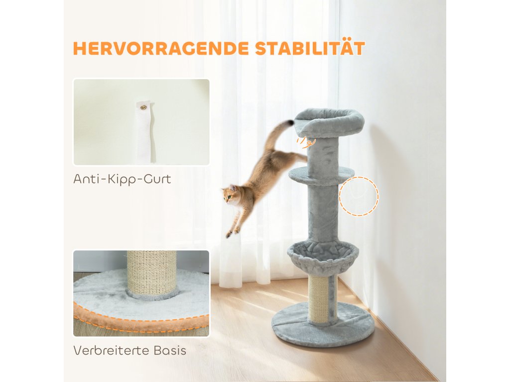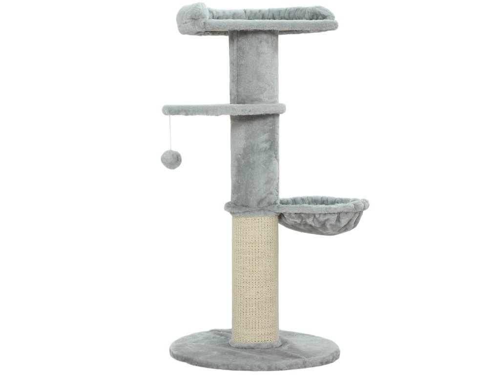 Škrabadlo pro kočky PawHut, sisalové sloupky, vícepatrové, plyšová látka, závěsná koule, světle šedá