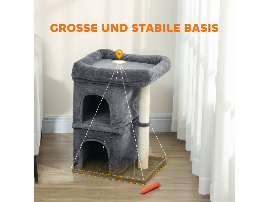 ✔ Široká základna a silné desky kočičího stromu zajišťují stabilitu pro aktivní kočky do 7 kg