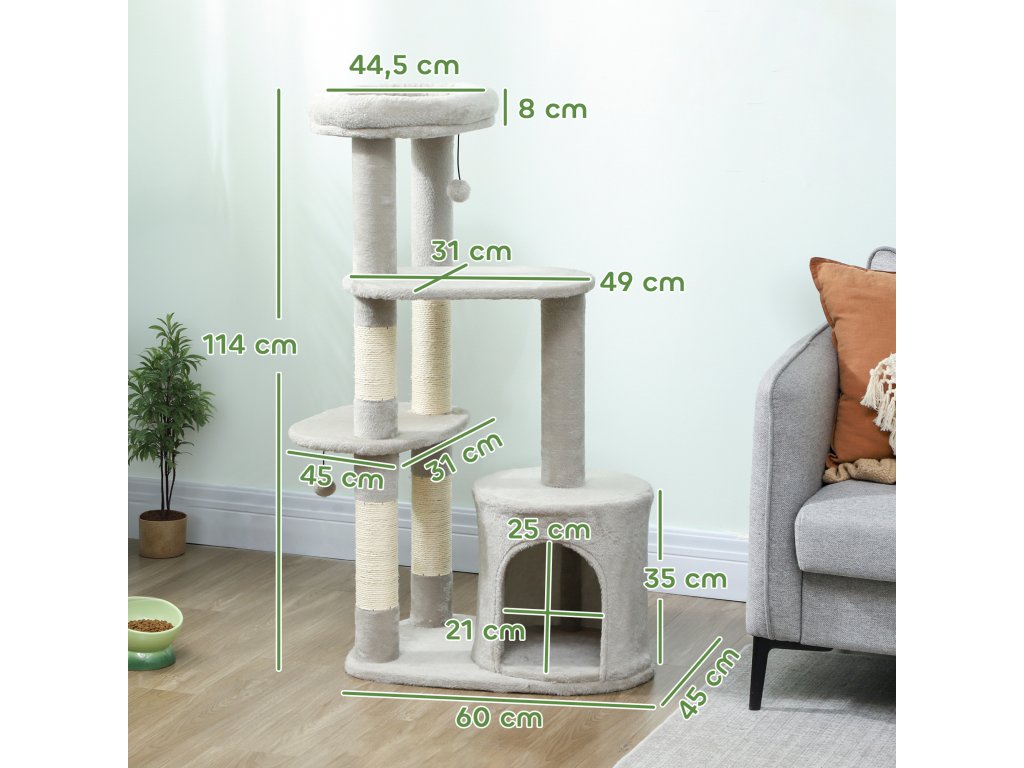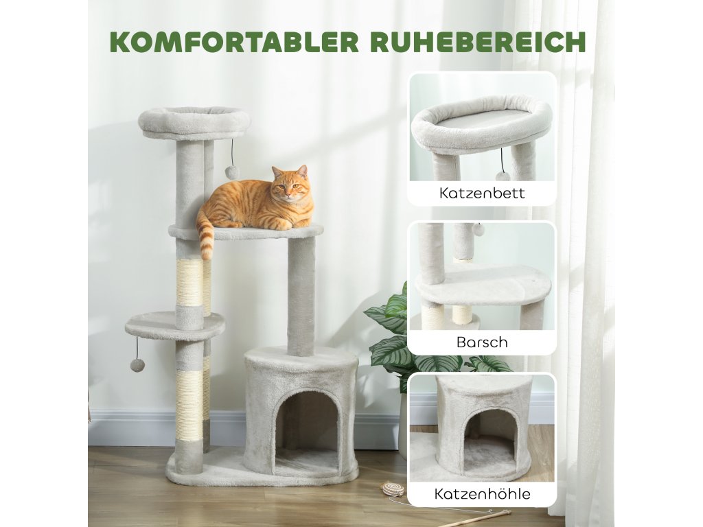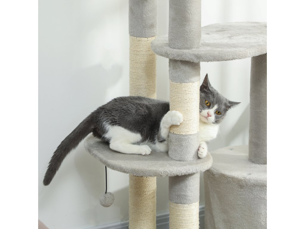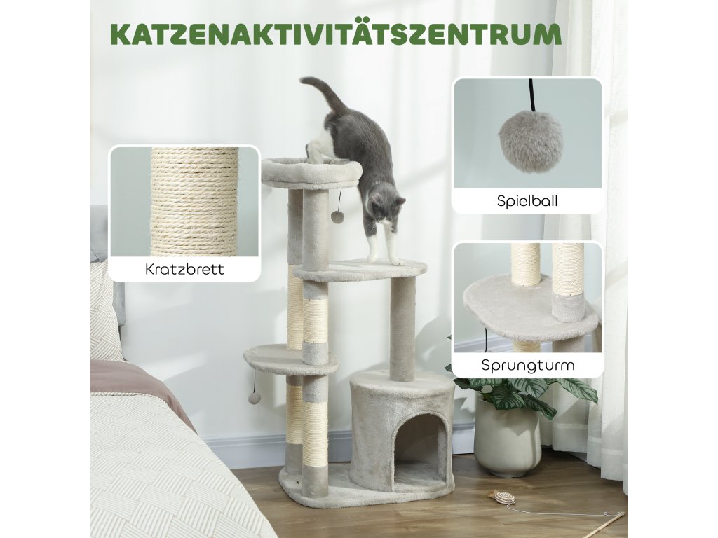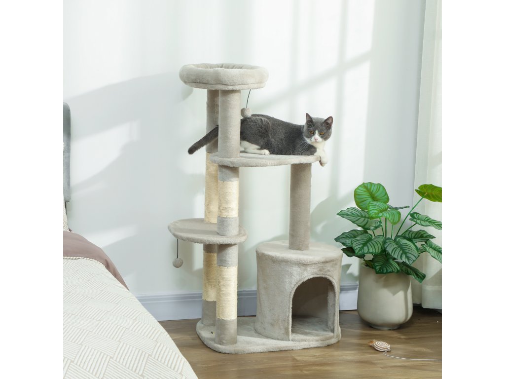 Škrabadlo pro kočky PawHut 114 cm s kočičí věží a jeskyní, sisalovými sloupky a plošinou, víceúrovňové pro střední kočky do 6 kg, světle šedé