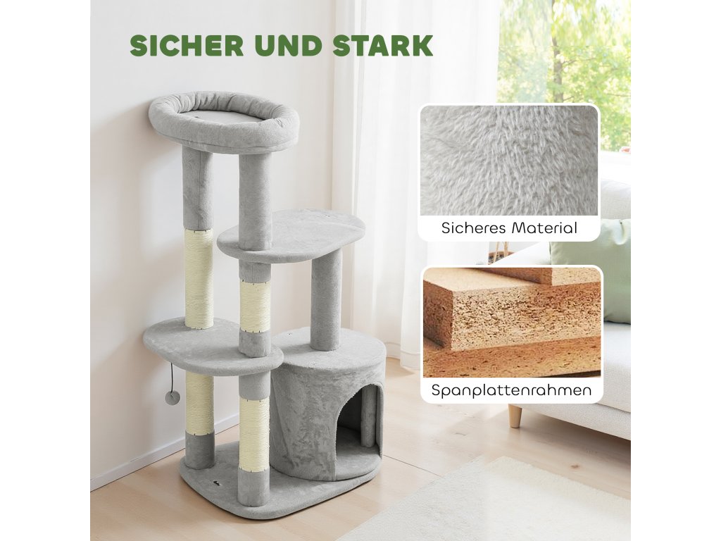 Stabilní a bezpečný: Vyrobeno z pevné dřevotřísky a sisalu, zesílená základna a velký kočičí domeček u paty kočičího stromu zajišťují stabilitu a bezpečnost ze všech směrů.