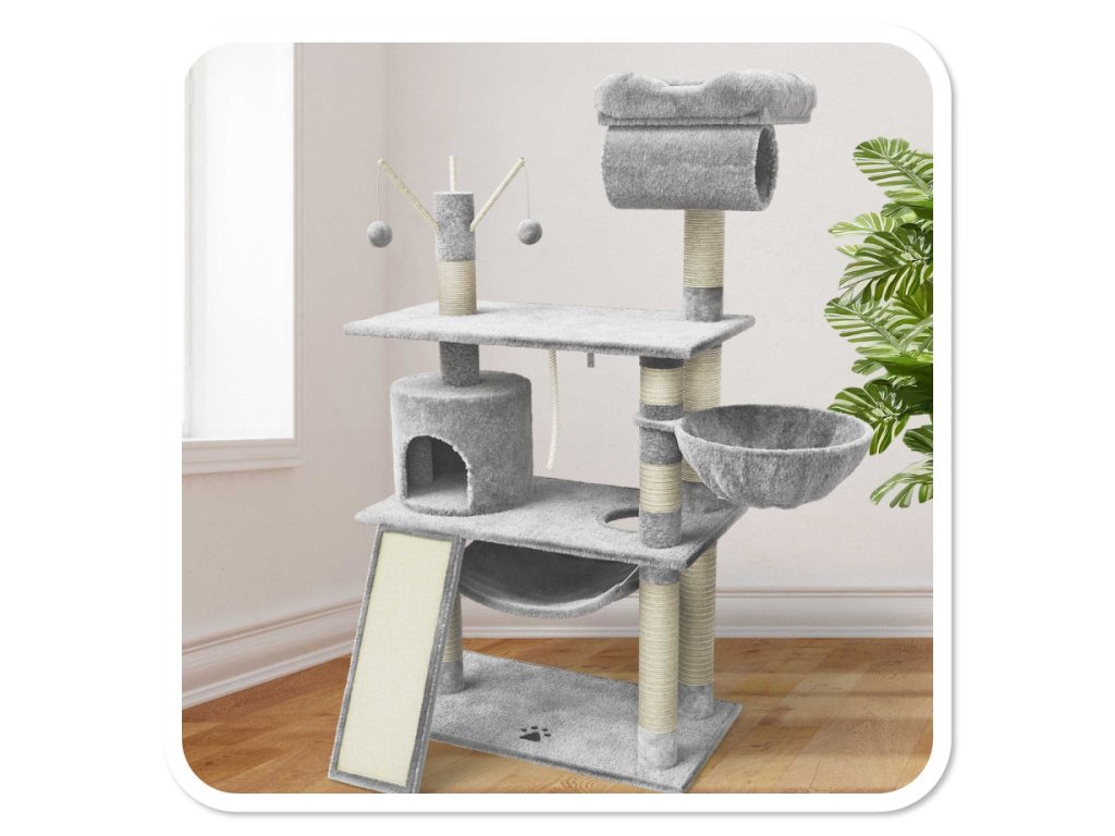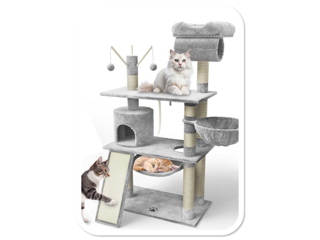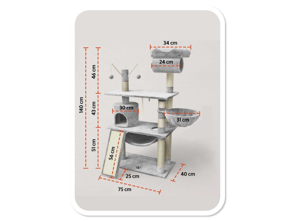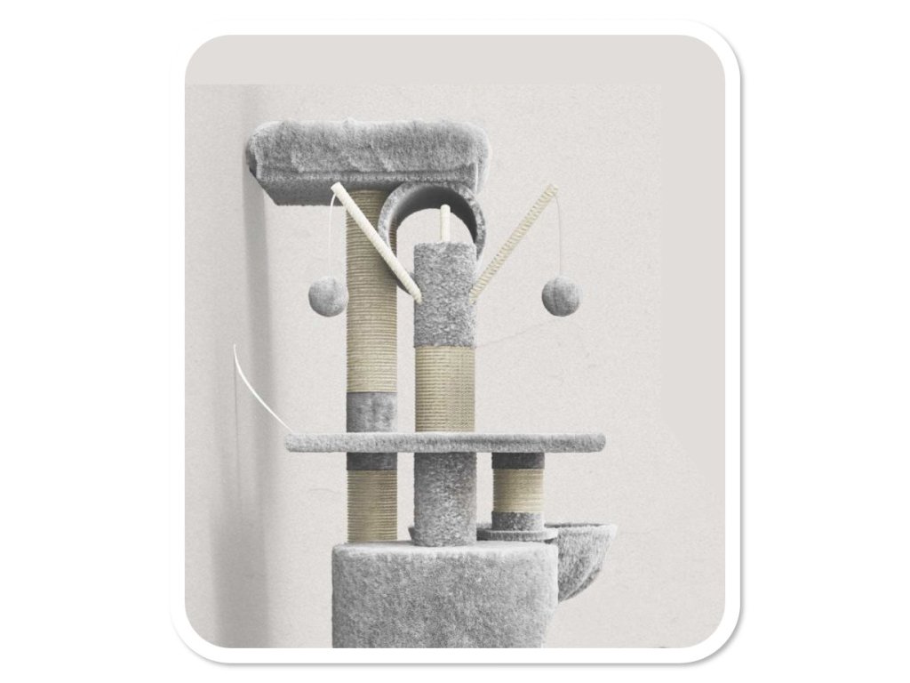 Škrábe vám Váš chlupatý mazlíček sedačku a šplhá po záclonách? S naším vymazleným škrabadlem už nebude! Dopřejte své kočičce luxusní útočiště. Toto víceúrovňové škrabadlo je dokonalou kombinací komfortu, bezpečí a zábavy, díky čemuž splní všechny potřeby vaší kočičky. Nabízí dva útulné domečky, tři vyvýšené plošiny, bambulky na hraní, dvě houpací síťe a sisalové škrábací sloupky. Moderní design v šedém provedení skvěle doplní váš interiér.