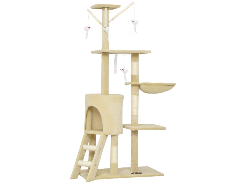 Škrabka pro kočky PawHut s jeskyní, 4 hračky, sisalové sloupky, velká plošina, schody, pro kočky do 5 kg, béžová