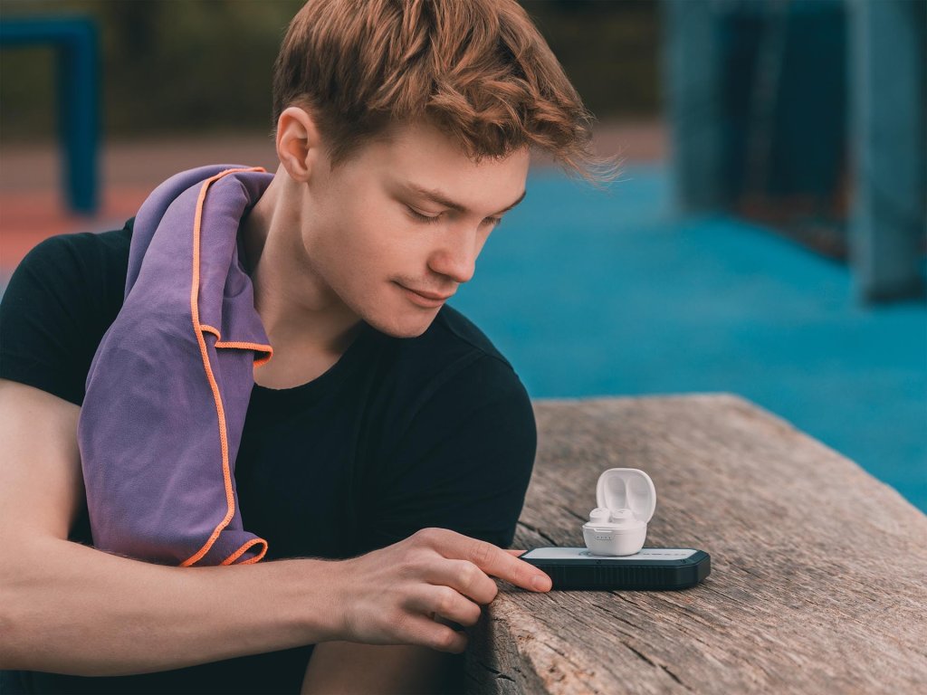 Pouzdro s kapacitou 550 mAh nabije špunty na max hned 5×. Zásuvku tak moc často hledat nemusíš. Samotná krabička se dobíjí taky vzduchem – stačí ji položit na bezdrátovou nabíjecí podložku.