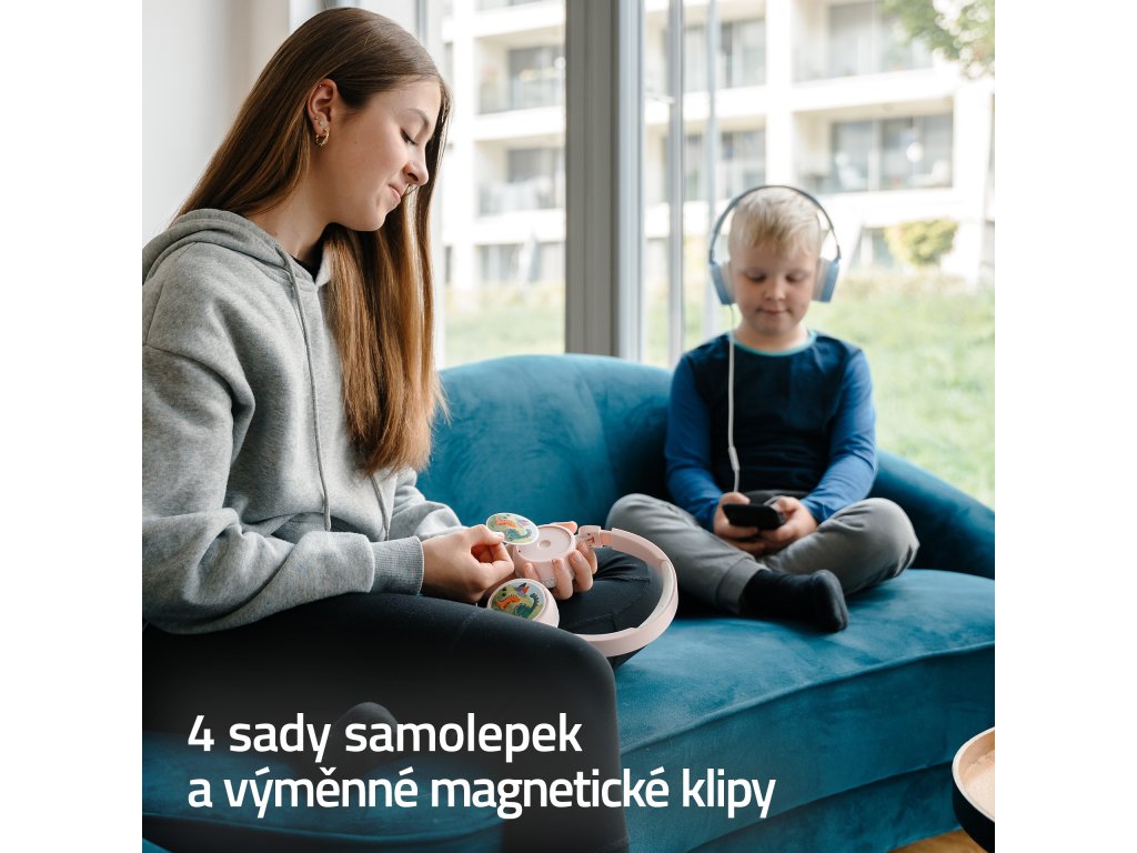 Svoje sluchátka si dítka mají možnost dozdobit k obrazu svému. Jeden set výměnných magnetických clipů na bok náušníků je bílý, ať už máte sluchátka v růžové nebo modré barvě, tuhle část si dítě dozdobí pokreslením nebo samolepkami, jak se mu líbí. Balení obsahuje i 4 sady samolepek, takže materiálu pro kreativní tvoření má víc než dost. Víc ukáže video tutoriál.