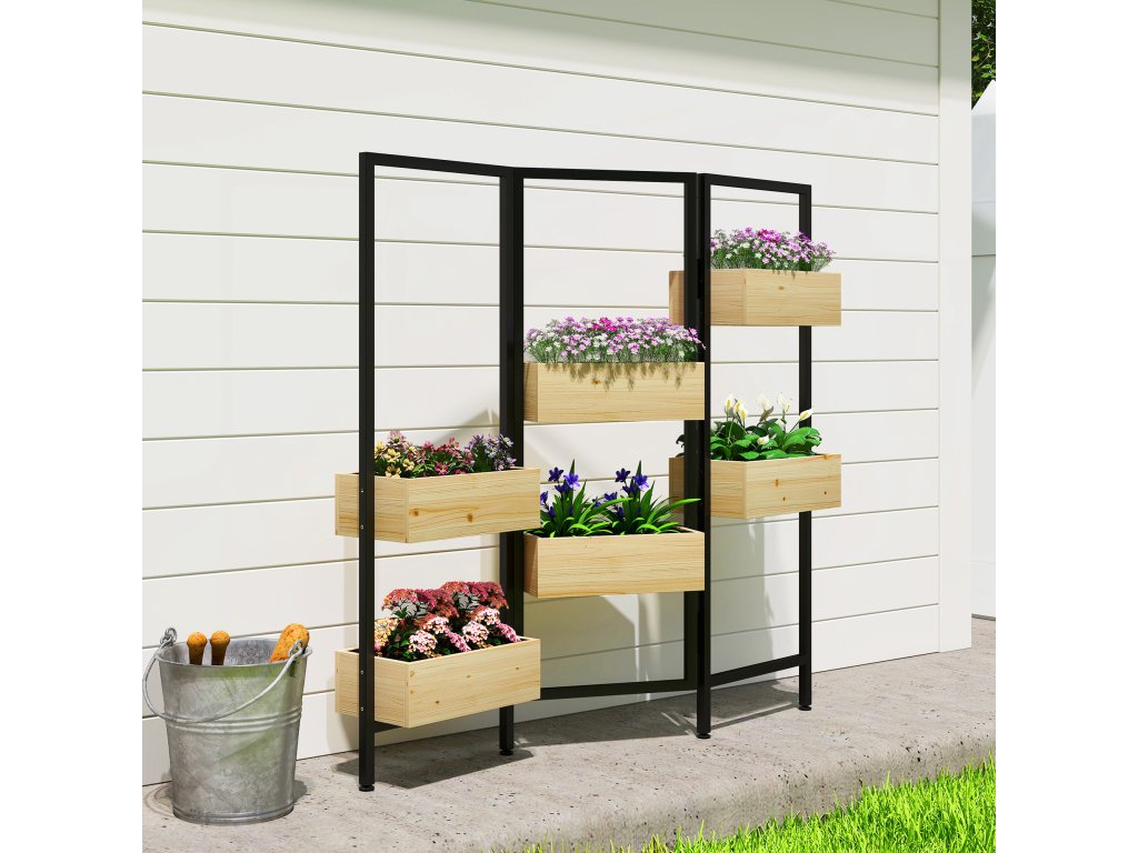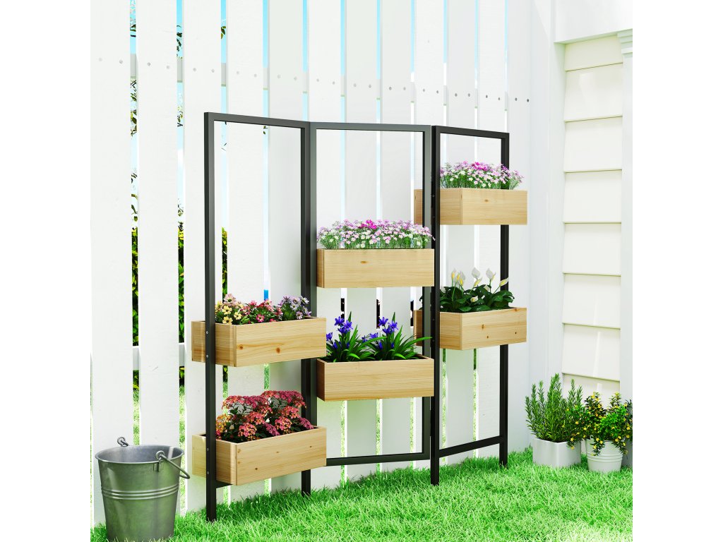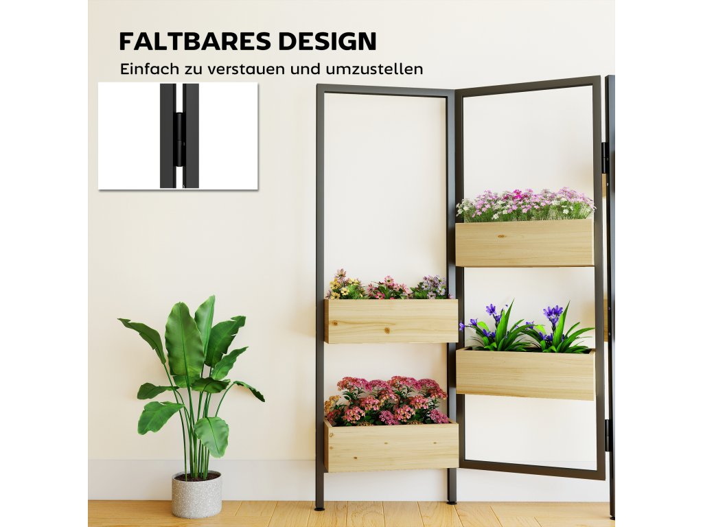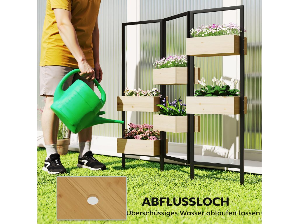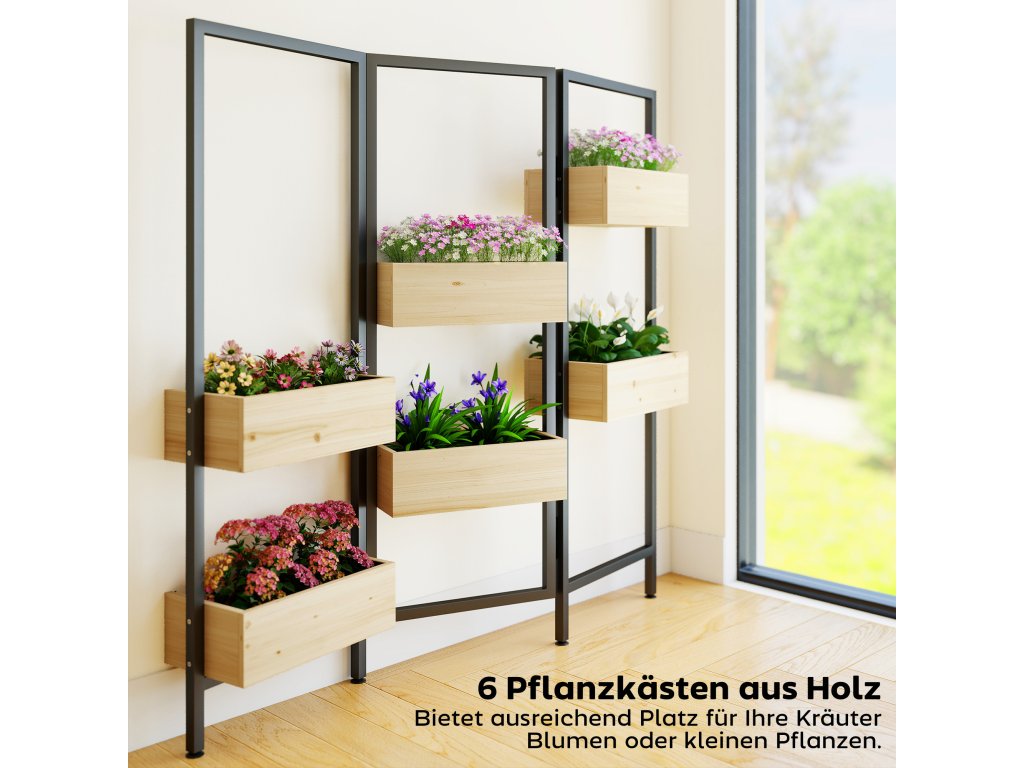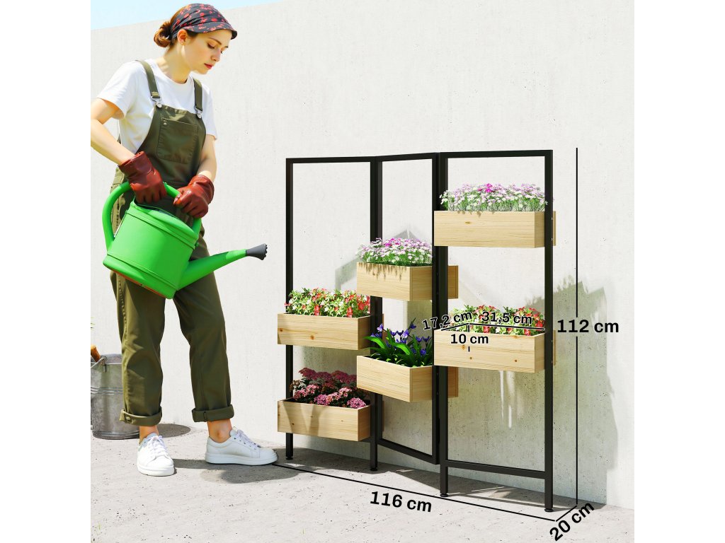Tato skládací dělicí stěna s květináči kombinuje oddělení prostoru s přírodní dekorací. Díky šesti dřevěným květináčům na pevném kovovém rámu umožňuje stylové vertikální uspořádání rostlin. Skládací konstrukce tohoto balkonového květináče usnadňuje skladování a drenážní otvory a látkové vložky podporují čistou výsadbu. Praktické a elegantní pro moderní obytné prostory.