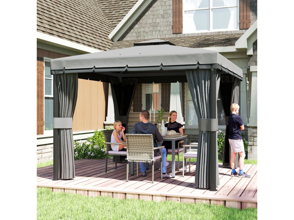 Dodá vašemu venkovnímu prostoru elegantní nádech s tímto altánkem o rozměrech 3 x 3 m od značky Outsunny! Altán nabízí vynikající ochranu před sluncem a deštěm a umožňuje vám, vaší rodině i hostům užívat si chladný vánek pod jeho velkorysou střechou. Díky robustnímu kovovému rámu a robustní střešní krytině vám tento zahradní altán spolehlivě slouží po mnoho let. Vylepšete si svou zahradu stinným a chladným útočištěm. ... Popis: