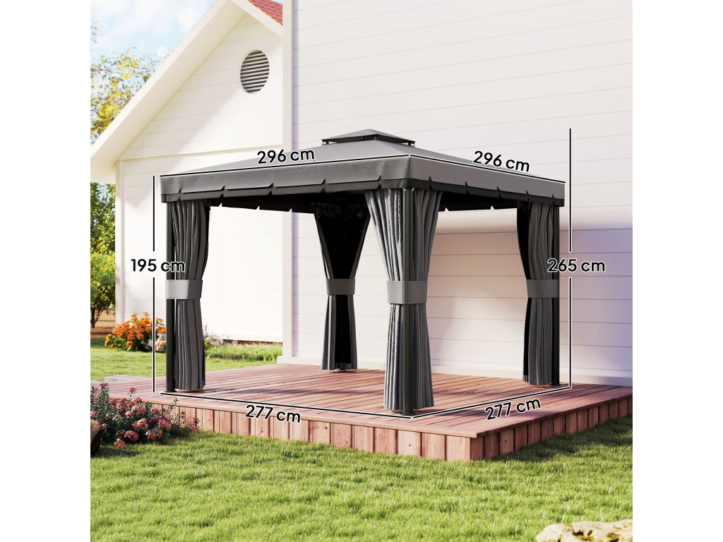 Podrobnosti o produktu zahradního altánu: Celkové rozměry: 2,96 D x 2,96 Š x 2,65 V m, výška okapu: 1,95 m. Nutná montáž. POZNÁMKA: Nedoporučuje se používat za extrémních povětrnostních podmínek, jako jsou bouřky nebo silný vítr/déšť.
