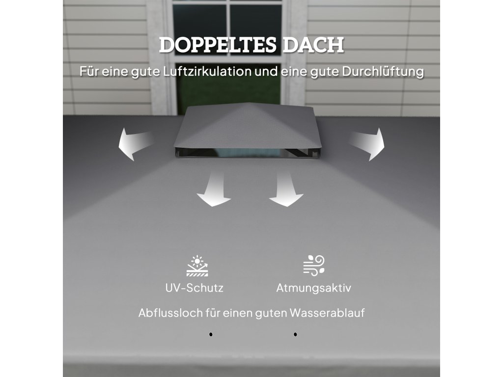 Dvoupatrová střecha: Dvoupatrová síťovaná střecha umožňuje dobrou cirkulaci vzduchu a chladný, Svěží atmosféra uvnitř altánu. Střešní krytina je vyrobena z potaženého polyesteru, který poskytuje vynikající ochranu před sluncem a deštěm. Osm zapuštěných drenážních otvorů zajišťuje snadný odtok dešťové vody.