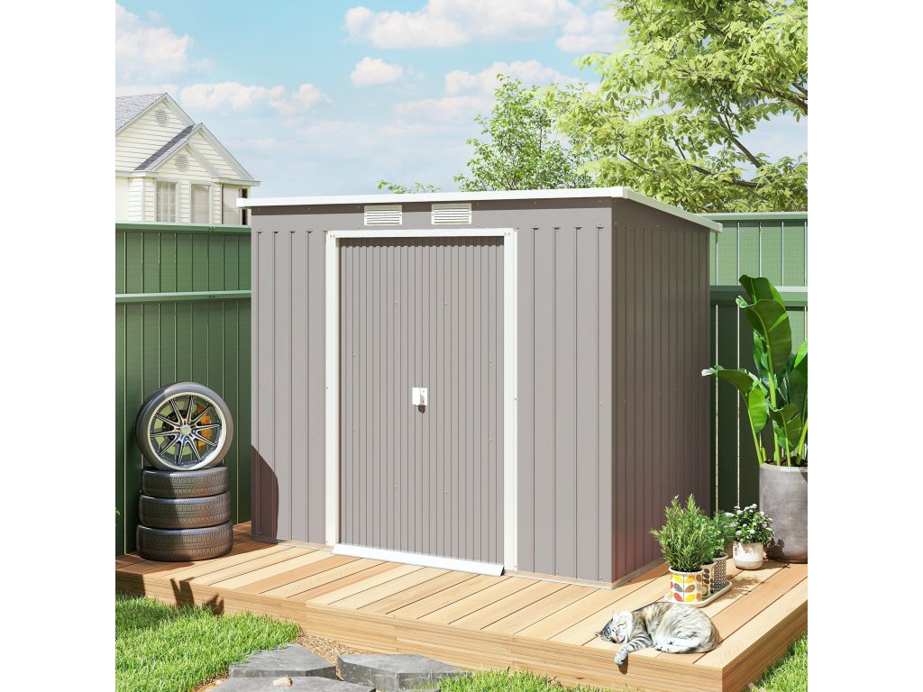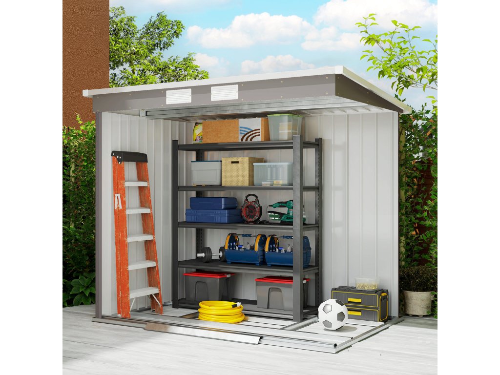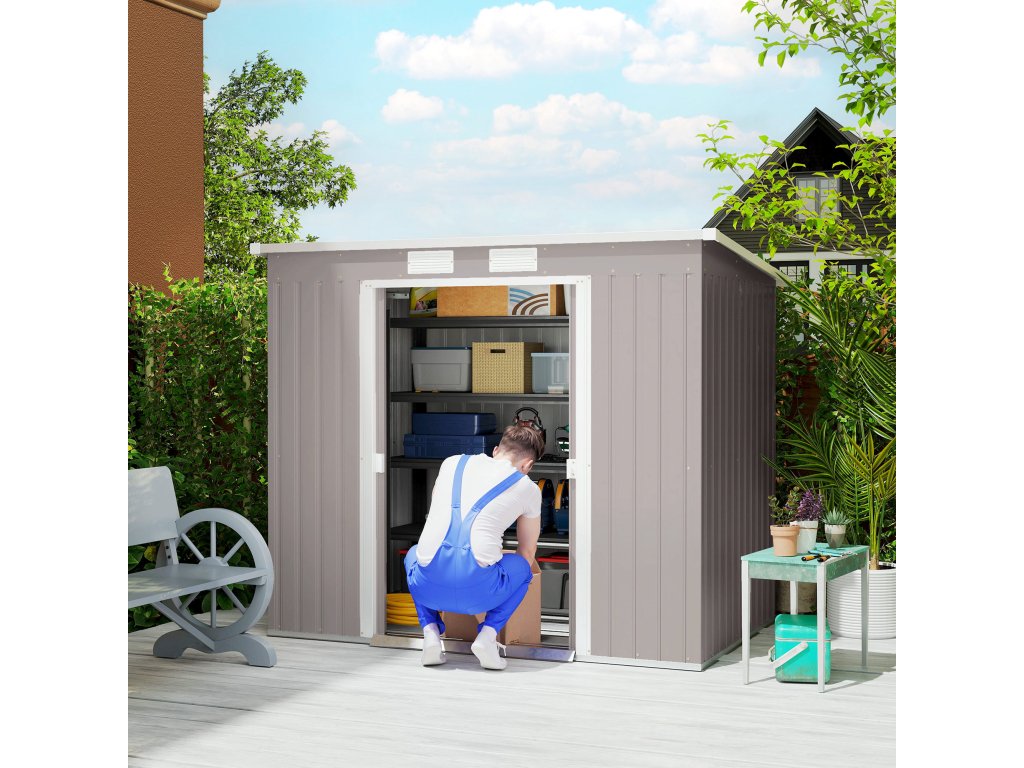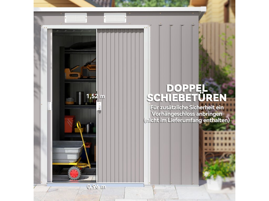 Zahradní domek Outsunny, vyrobený z vysoce kvalitní oceli odolné proti korozi, zaručuje odolnost a ochranu vašeho zahradního nářadí. Šikmá kovová střecha zabraňuje hromadění vody a dvojité dveře umožňují snadný přístup. Dvě větrací okna zajišťují suchý interiér bez plísní. Vneste do svého venkovního prostoru pořádek a eleganci – tento praktický zahradní domek promění vaši zahradu v opravdový poutač! Popis: