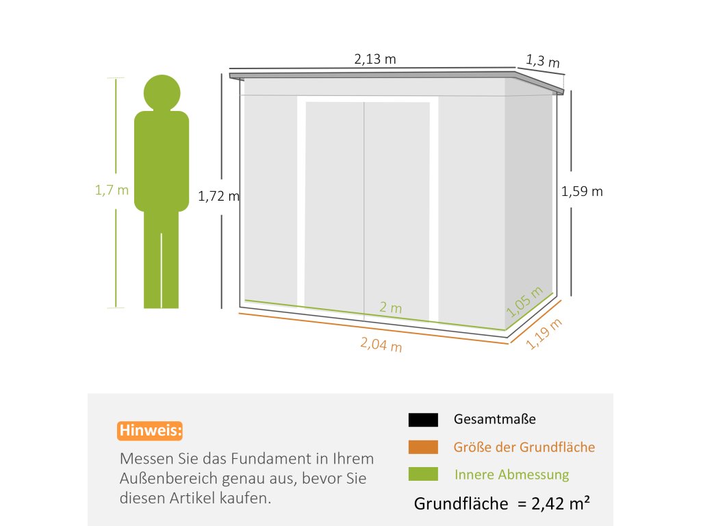 Podrobnosti o produktu zahradního domku: Celkové rozměry: 213D x 130Š x 172V cm, včetně základního rámu (bez základů). Montáž je nutná; potřeba tři osoby, doba montáže přibližně tři hodiny. Vždy používejte rukavice a vyhněte se montáži ve větrném počasí.