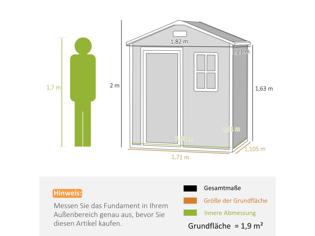 Prostorný interiér: Zahradní domek o rozměrech 182 x 121 x 200 cm nabízí velkorysý úložný prostor o rozměrech 163 x 101 cm, kde můžete úhledně a snadno uložit veškeré zahradní nářadí a vybavení.