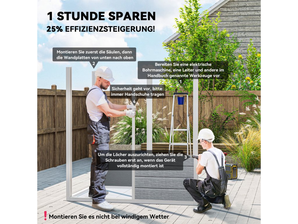 Detaily montáže: Zahradní domek se snadno montuje pomocí modulárního systému, vyžaduje 2–3 osoby a trvá přibližně 3 hodiny. Nemontujte prosím za silného větru a při montáži vždy používejte rukavice, abyste předešli zranění.