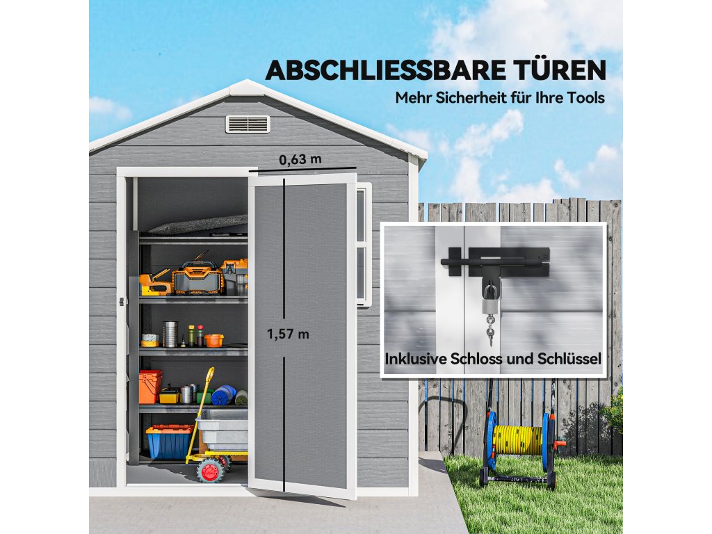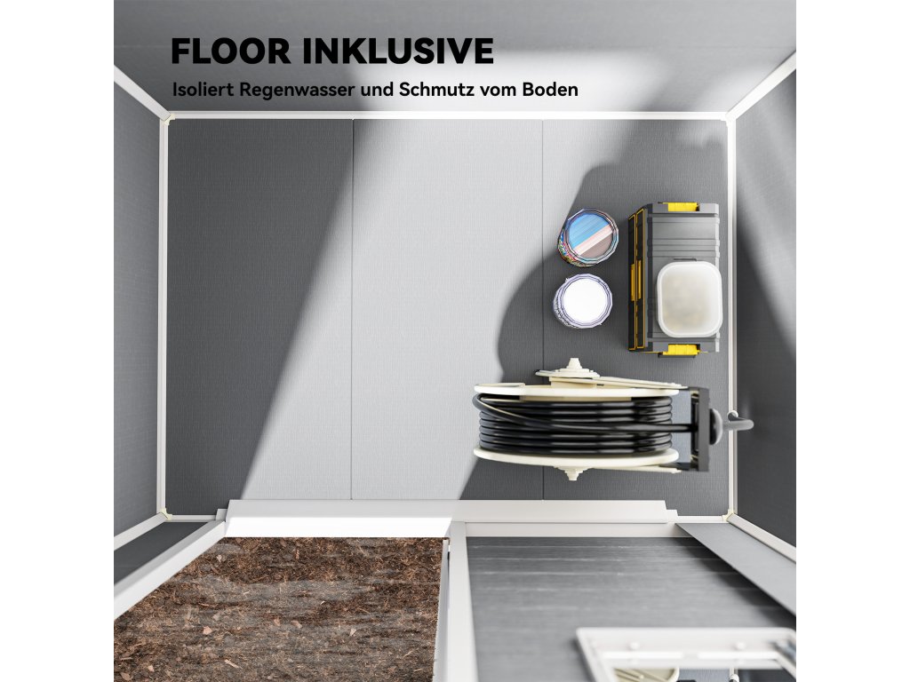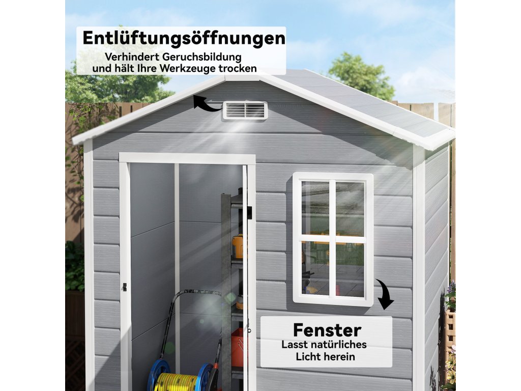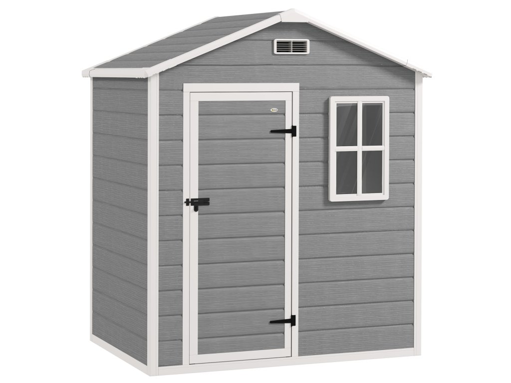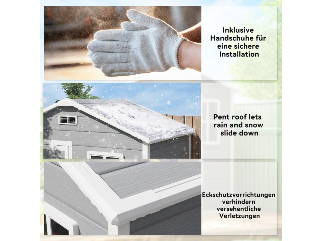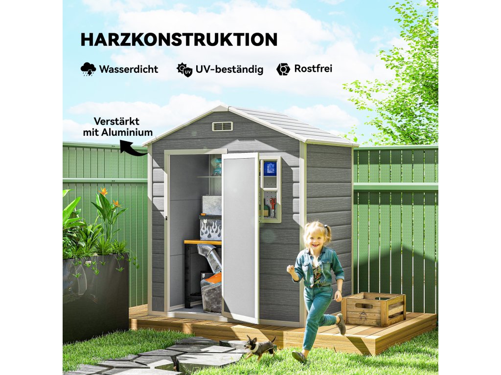 Ochranná pryskyřičná konstrukce: Zahradní domek je vyroben z 12 mm silné polypropylenové pěny imitující dřevo s hliníkovou výztuhou, je zcela vodotěsný, odolný vůči UV záření a korozi. Podlaha poskytuje spolehlivou ochranu proti pronikání vlhkosti.