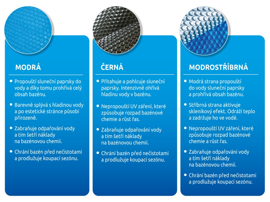 Pri pravidelném používání solární plachta zamezuje spadu necistot do bazénu a minimalizuje odparování vody, címž snižuje ztráty aplikované bazénové chemie.