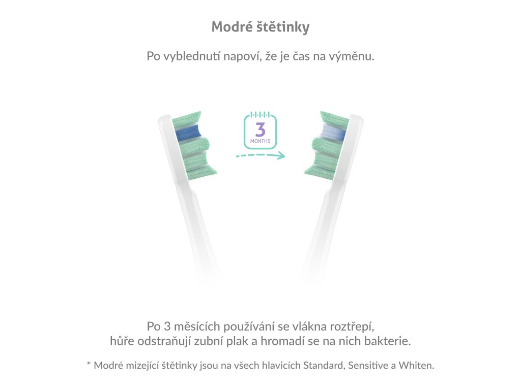 Zhruba po 3 měsících je třeba vyměnit hlavici kartáčku, aby byla zajištěna kvalita čistění. Poznáte to dle modrých štětinek, které postupně bělají.