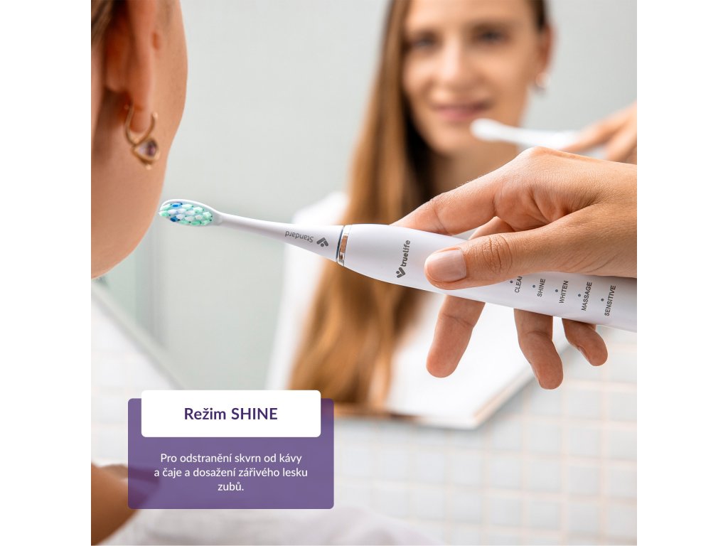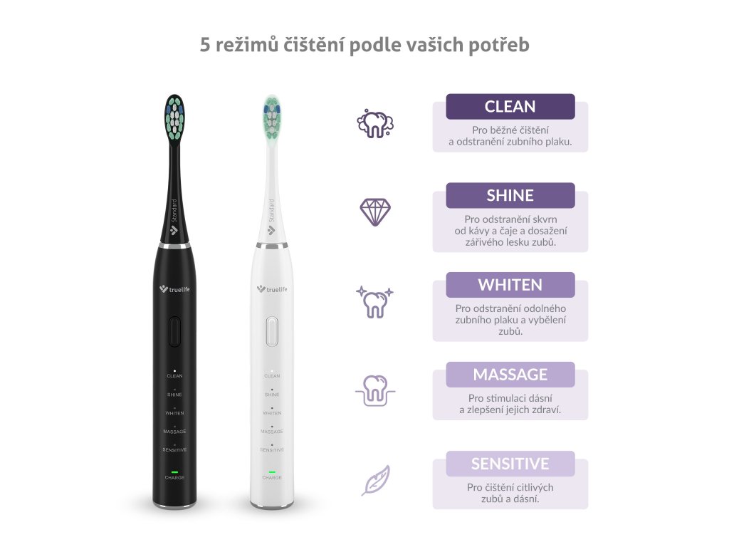 Sonické kartáčky TrueLife SonicBrush Clean30 obsažené v sadě disponují 5 režimy čištění, jež usnadňují každodenní péči o zuby a dásně. Běžné čištění obstará režim Clean, s odolnějším zubním plakem zatočí režim Whiten, který zároveň přispívá k bělení zubů. Dokonale zářivý úsměv zajistí režim Shine efektivně odstraňující pigmentové skvrny způsobené například kávou či čajem. Patříte-li k lidem s citlivějšími zuby a dásněmi, pak oceníte režim Sensitive. Ke zdravějším dásním přispěje režim Massage, a to jejich stimulací. Ideální doba čištění jsou 2 minuty, hlídat je ale nemusíte, časovač to obstará za vás. Také vždy po 30 sekundách upozorní, že je čas přesunout se na další část chrupu.