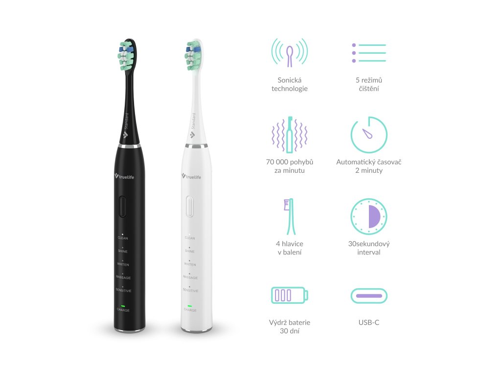 Pravidelná dentální péče je základem každodenních hygienických rituálů. Zajistí vám nejen krásný úsměv, ale návštěva zubaře už pro vás nebude strašákem. Díky sadě dvou sonických kartáčků TrueLife SonicBrush Clean30 v kombinaci Black & White si tento komfort můžete dopřát třeba spolu s partnerem. Kartáčky jsou vybaveny sonickou technologií SonicTrue® a 70 000 pohybů za minutu, které každý z nich vykoná, dokonale a šetrně vyčistí zuby. Využít však lze i režimu pro masáž dásní. Kartáčky disponují 5 režimy – Clean, Shine, Whiten, Massage a Sensitive. Součástí duo packu jsou 4 hlavice (2 Standard, Sensitive a Whiten), u nichž snadno poznáte, kdy je čas na výměnu, a to díky modrým štětinkám, které po určité době zbělají. Ke každému kartáčku náleží cestovní pouzdro, opět v černém a bílém provedení. Baterie kartáčku vydrží 30 dní a následně jsou pro dobití určeny přiložené USB-C kabely.