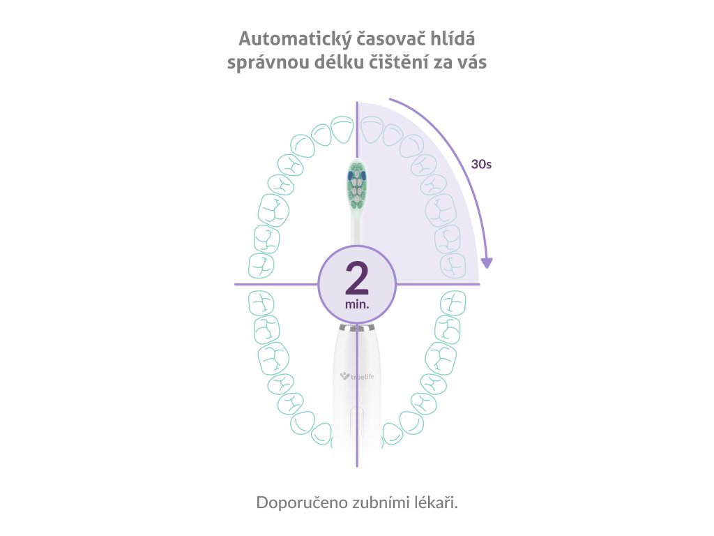 Časovač natavený na 2 minuty je rozdělen do 4 částí po 30 sekundách. Krátké přerušení vždy upozorní, že je čas začít čistit další část chrupu.