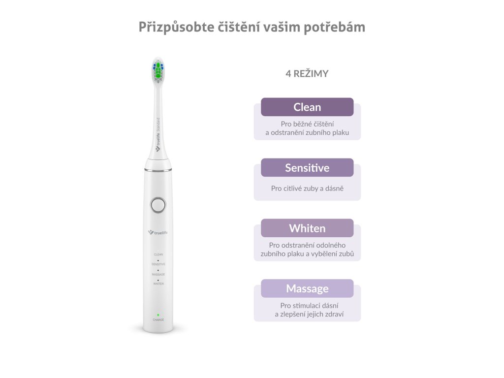 Pro maximální účinnost jsme kartáček vybavili hned čtyřmi režimy. Dohromady se skvěle postarají o vaše ústa – ať chcete mít bělejší úsměv, správně prokrvit dásně nebo si jen efektivně vyčistit zuby.