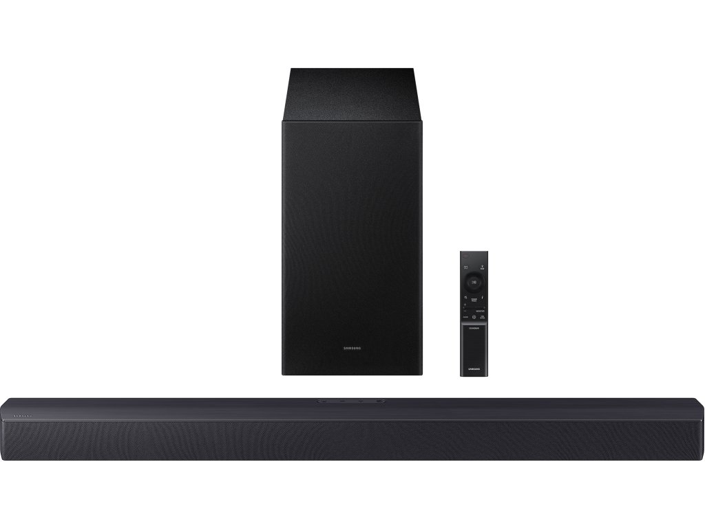 Samsung soundbar, 300 W, počet kanálů 2.1, 3 reproduktory, 6,5" Aktivní Bezdrátový subwoofer, Dolby Digital 2.0ch, DTS Virtual:X, DTS 2.0, Bluetooth 4.2, USB vstup, optický audio vstup, podporované formáty: MP3, AAC, OGG, FLAC, WAV, AFF, ovládání TV a SB jedním ovladačem, Sound Módy: Bass Boost, SSE, Standard, Adaptive Sound, DTS Virtual:X, Game, Voice enhance mode, Night mode, držák na stěnu v baleni, Titánová černá barva