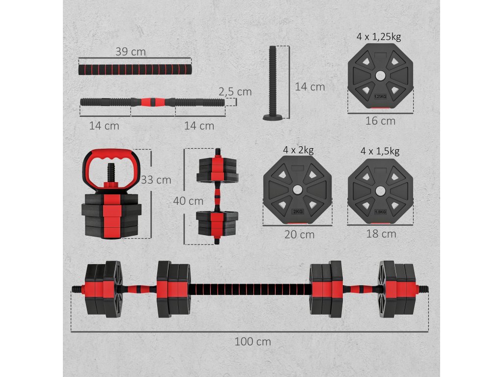 - Celkové rozměry činky: 100L x 18W x 18H cm. desky o hmotnosti 2 kg: 19,5L x 18W x 4H cm. desky o hmotnosti 1,5 kg: 18L x 16,5W x 3,5H cm. desky o hmotnosti 1,25 kg: 16L x 15W x 3,5H cm.