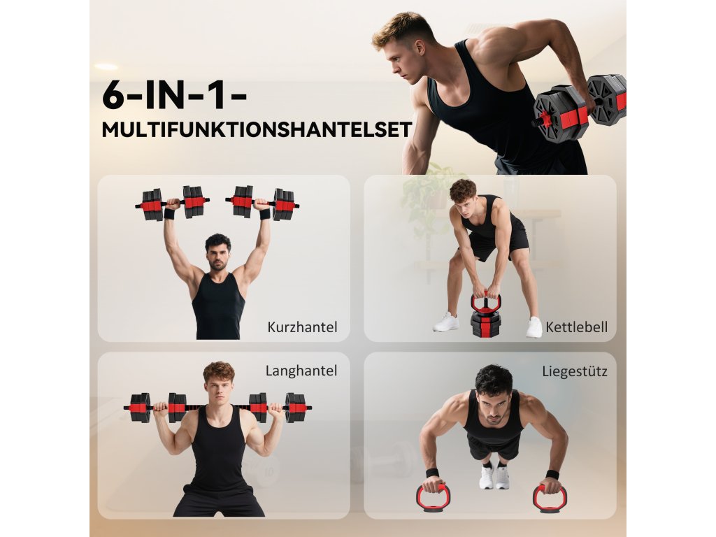 - multifunkční design 6 v 1: Zvyšte svůj trénink s touto univerzální sadou činek, kterou lze přeměnit na kettlebelly, činky, činky nebo stojan na kliky. Přepínejte bez námahy mezi cviky a zpestřete si svůj fitness program!