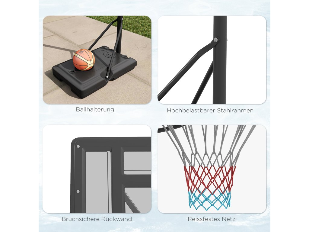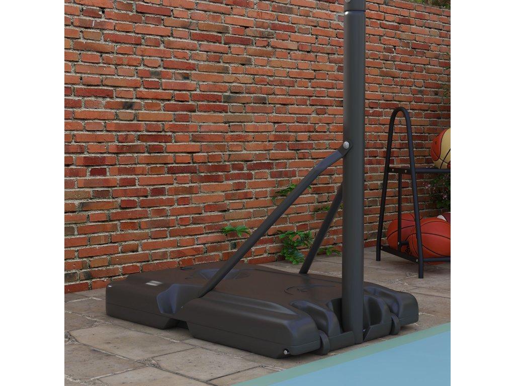 S tímto venkovním basketbalovým stojanem SPORTNOW můžete házet na koš jako profesionál. Díky kolečkům ho můžete snadno přemístit - na terasu nebo do sportovní haly. Lze jej také pohodlně výškově nastavit tak, aby vám vyhovoval, a ne naopak. Skvěle se vyjímá i venku: robustní, nerezavějící a nerozbitný materiál odolá každému počasí. Základnu lze naplnit až 90 kg vody nebo písku, což zaručuje špičkovou stabilitu.