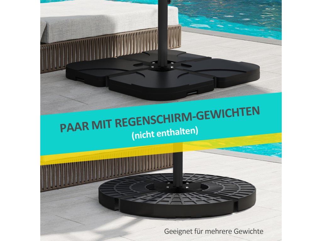 Křížový stojan na slunečníky Outsunny je vhodný jak pro malé slunečníky s konzolou, tak pro velké slunečníky se středovou tyčí. Nabízí flexibilitu pro různé slunečníky. Náš venkovní stojan na slunečníky se snadno nastavuje - stačí vložit stojan na slunečník, utáhnout šrouby a zkombinovat se zátěžovými bloky pro větší stabilitu.