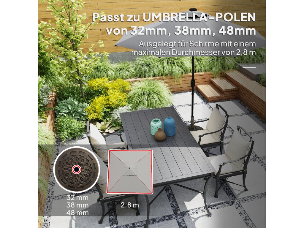 - Univerzální kompatibilita: Tento stojan na deštníky je vhodný pro většinu tržních deštníků s průměrem tyče 32, 38, 48 mm a průměrem deštníku až 2,8 m. Ideální pro různé venkovní konstrukce.