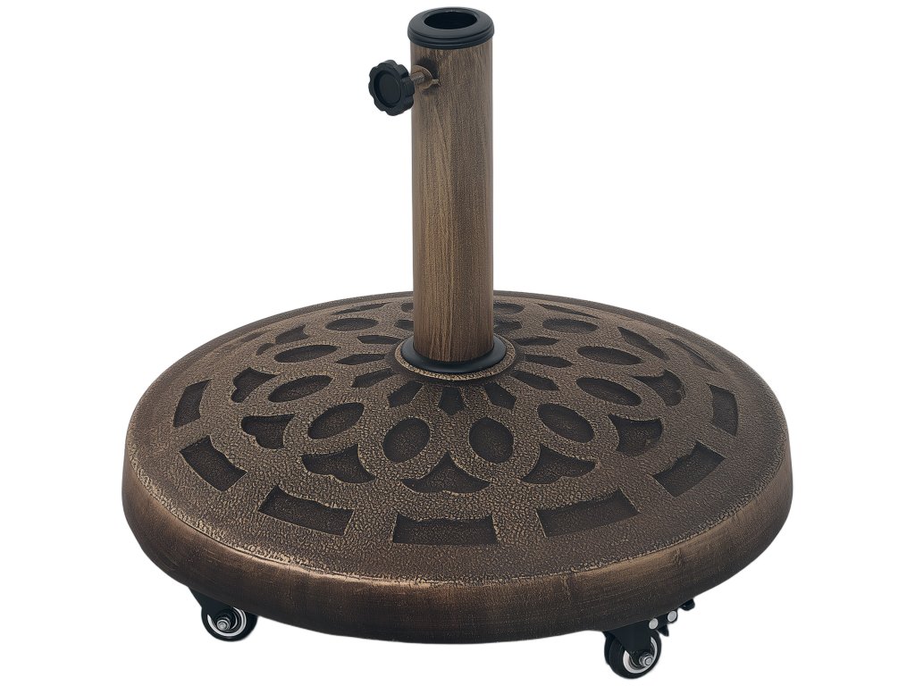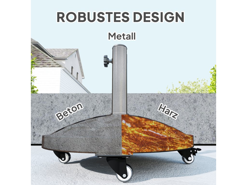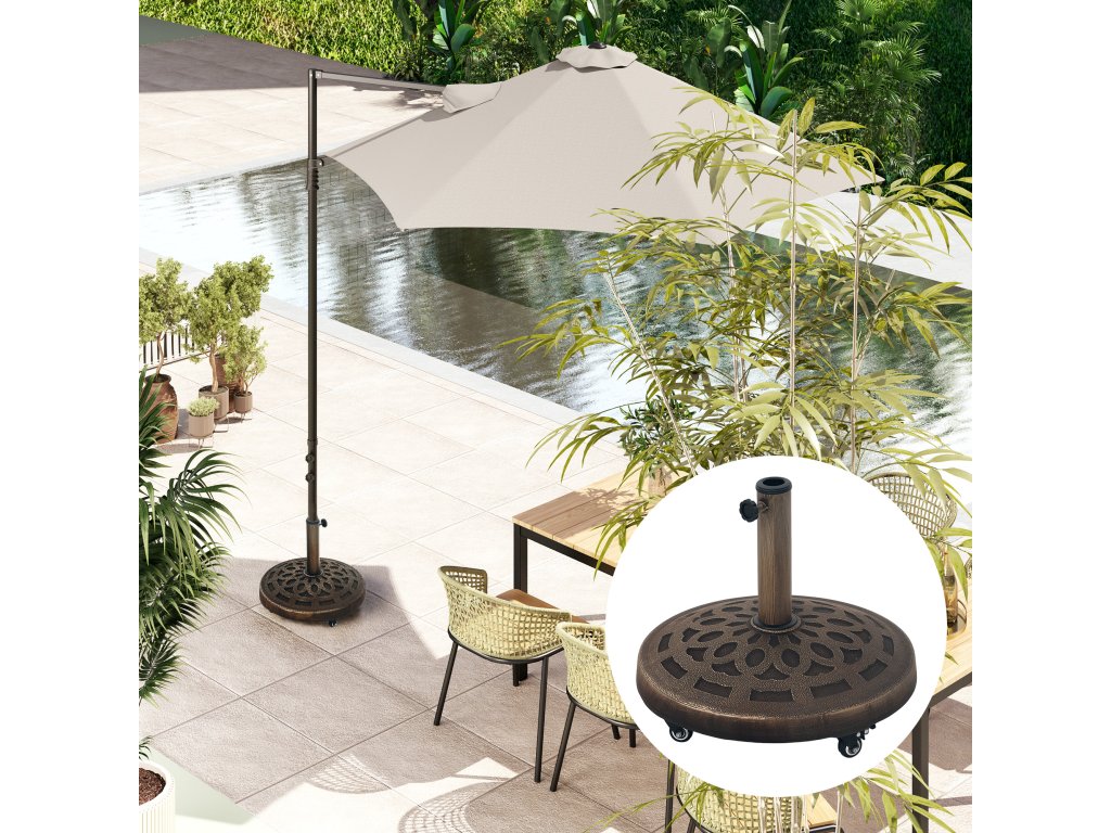 - Robustní podstavec pro slunečníky: Tento podstavec pro slunečníky s hmotností 21 kg, vyrobený z kovové tyče s práškovým nástřikem a základny z pryskyřice a betonu, nabízí optimální stabilitu a odolnost. Podstavec slunečníku na kolečkách zajišťuje stabilní držení a je odolný vůči povětrnostním vlivům.