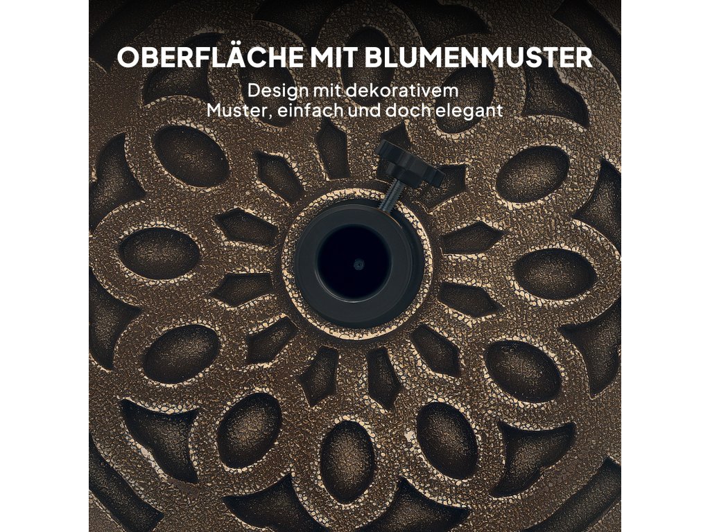 Zažijte venkovní životní styl bez spálení od slunce se stylovým stojanem na slunečník Outsunny na kolečkách. Design stojanu na slunečník s povrchem připomínajícím květiny se skvěle hodí na zahradu nebo na terasu. Zkombinujte slunečník, stolek a židle a vytvořte si oázu pohody. Zatížený stojan drží slunečník bezpečně a stabilně pro optimální zastínění. Užívejte si pohodlí stojanu na slunečník Outsunny venku.
