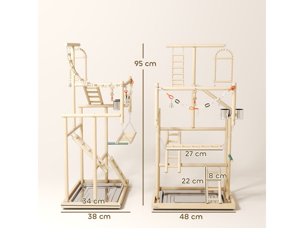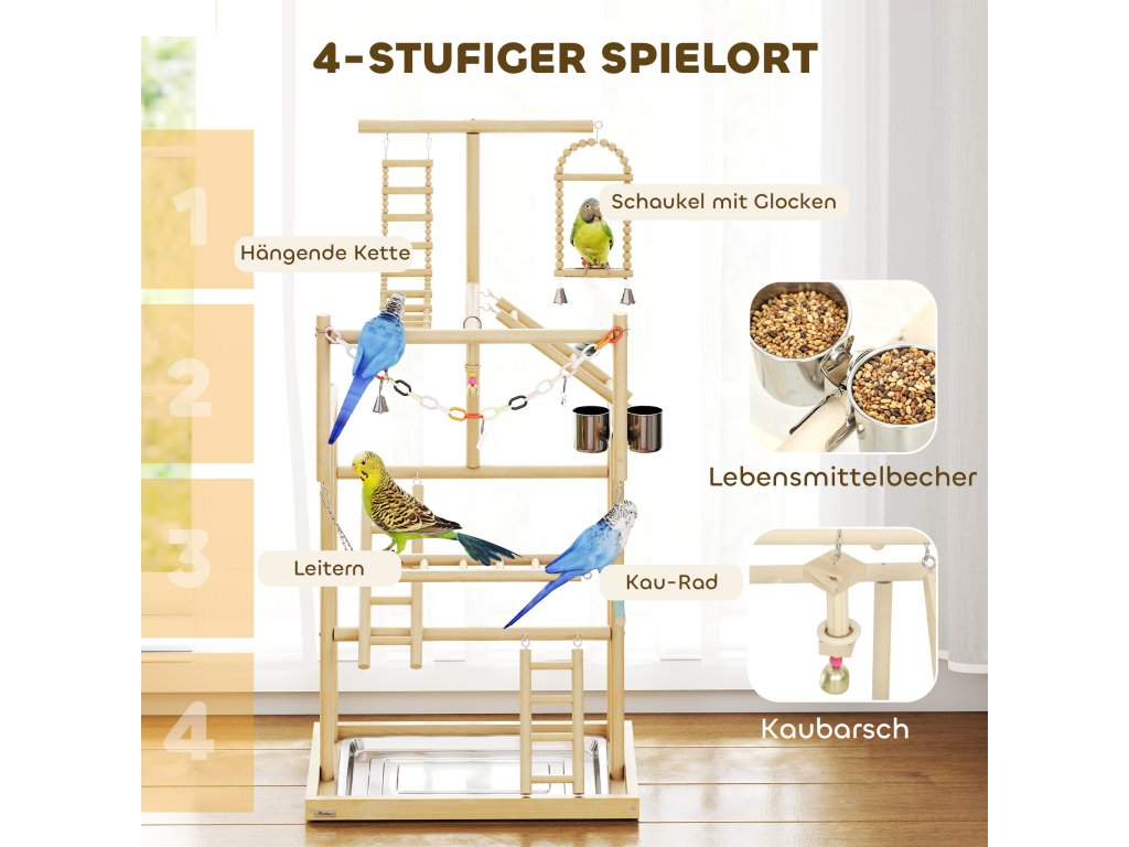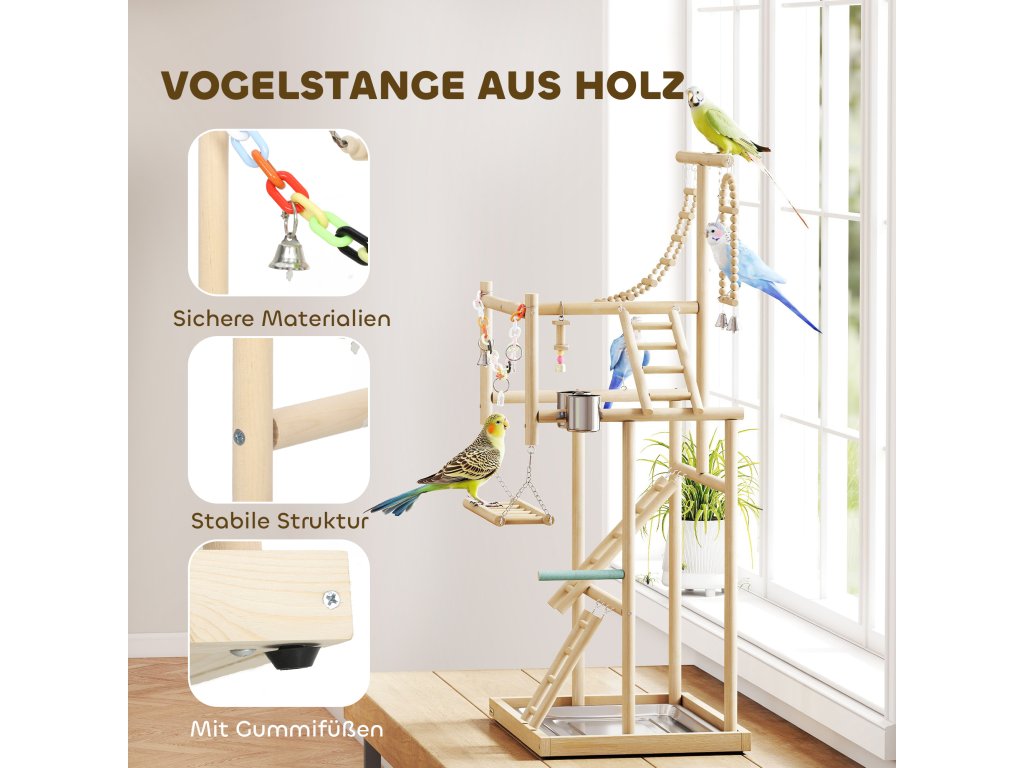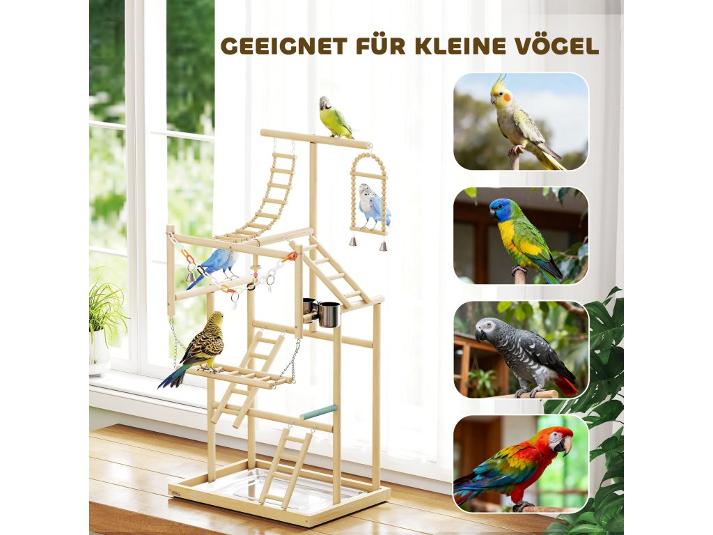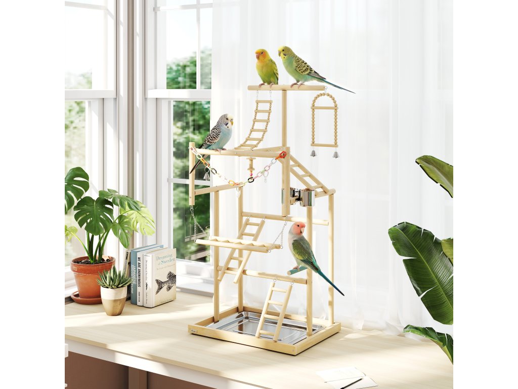Ptačí hřiště PawHut nabízí ptákům bezpečnou zábavu. Ptačí strom je vyroben z leštěného masivního dřeva s robustními gumovými nožičkami, je bez zápachu a pohodlný. Čtyři úrovně s žebříky, houpačkami, zásobníky na krmivo a hračkami podporují aktivitu. Odnímatelný zásobník z nerezové oceli usnadňuje čištění. Ptačí hřiště, které lze sestavit během 30 minut a které je ideální pro andulky, kakadu, konury a hrdličky, podporuje pohyb a podporuje společnou hru.