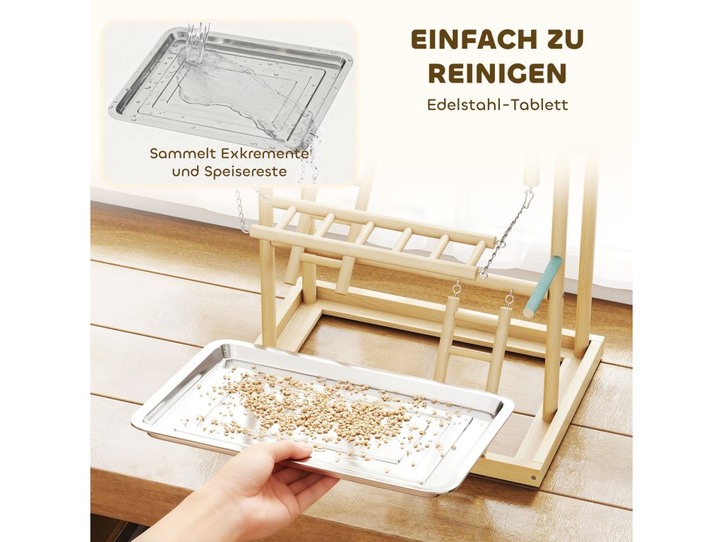 - Snadno se čistí: Tento hrací koutek pro andulky je vybaven odnímatelnou vaničkou z nerezové oceli, která zachycuje nečistoty a snadno se čistí, což usnadňuje udržování čistého a hygienického prostředí.