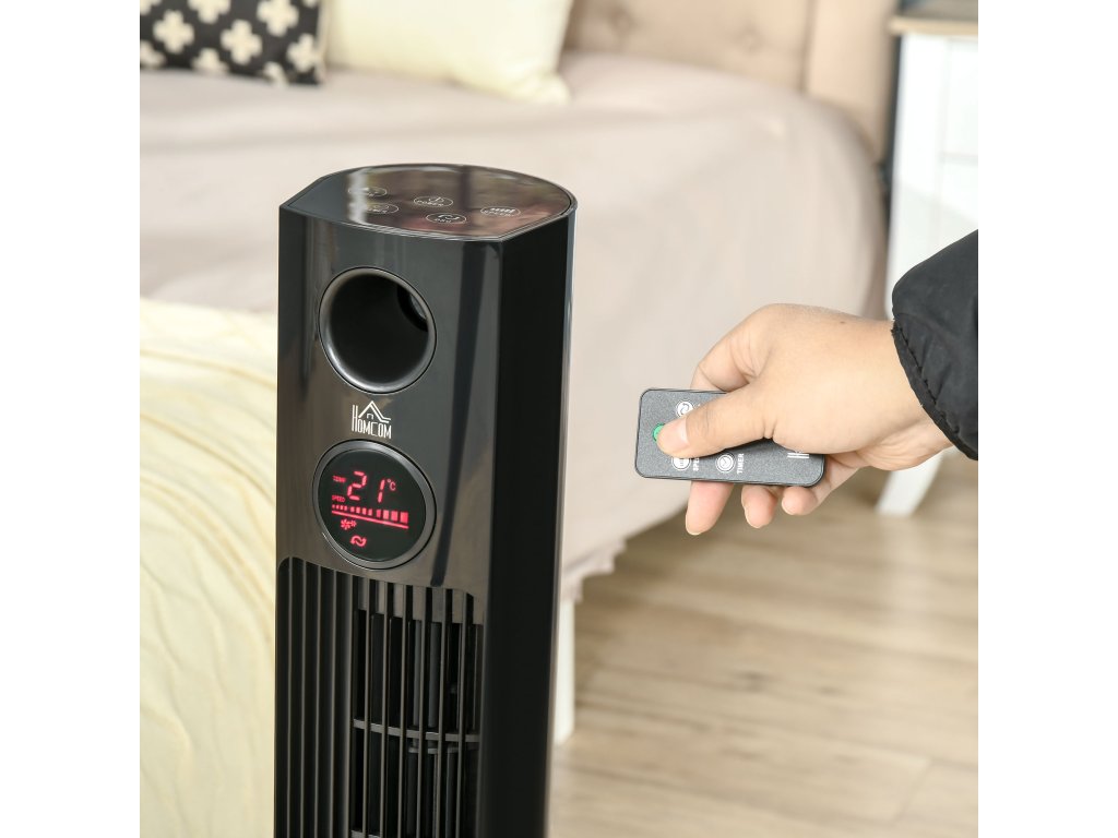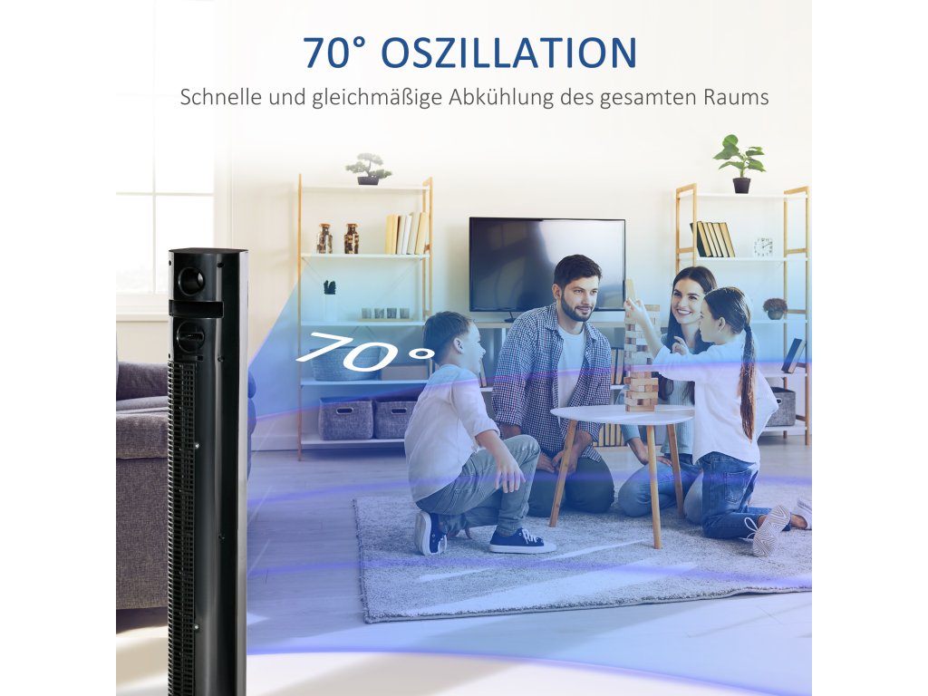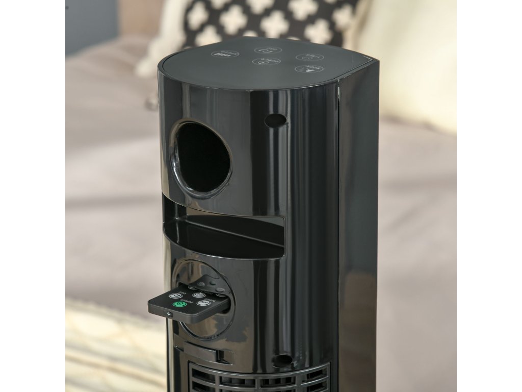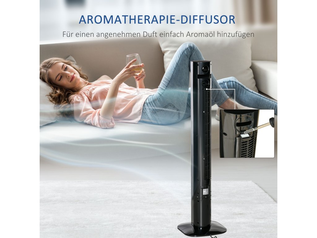 Stojanový ventilátor s dálkovým ovládáním, 45 W, 12hodinový časovač, 70° oscilace, 3 úrovně ventilace, s difuzérem aroma, 31,5 x 31,5 x 117 cm, černý