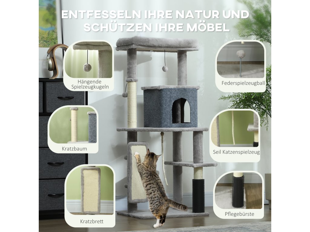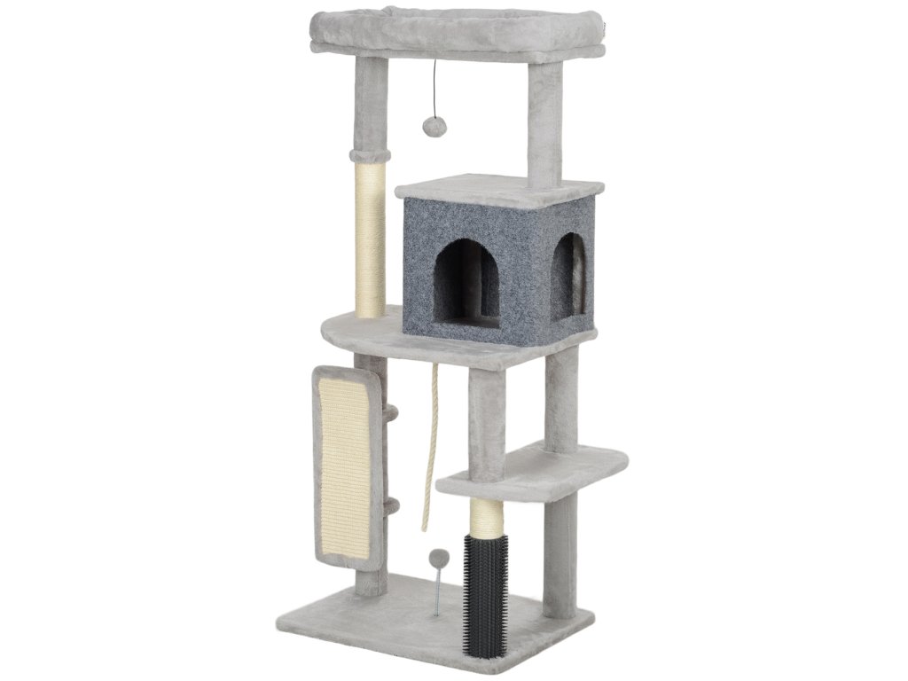 Strom pro kočky PawHut 132 cm se škrabadlem, pelíškem, domečkem, skákacími plošinami, kartáčem na hřebelcování, světle šedý