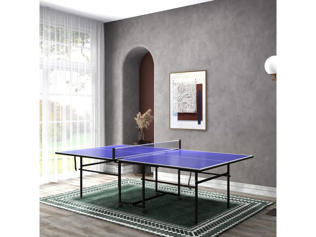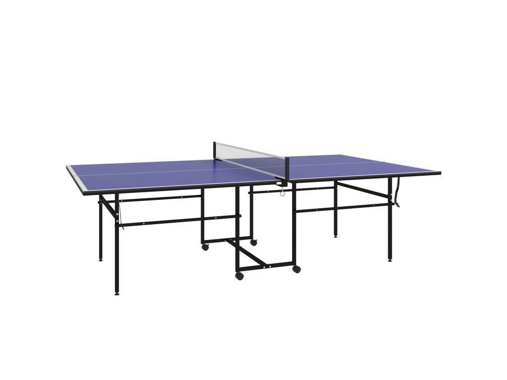 Stůl na stolní tenis SPORTNOW, skládací, pojízdný, 2 pálky, 3 míčky, kovový rám, 274x152,5x76 cm, modrý