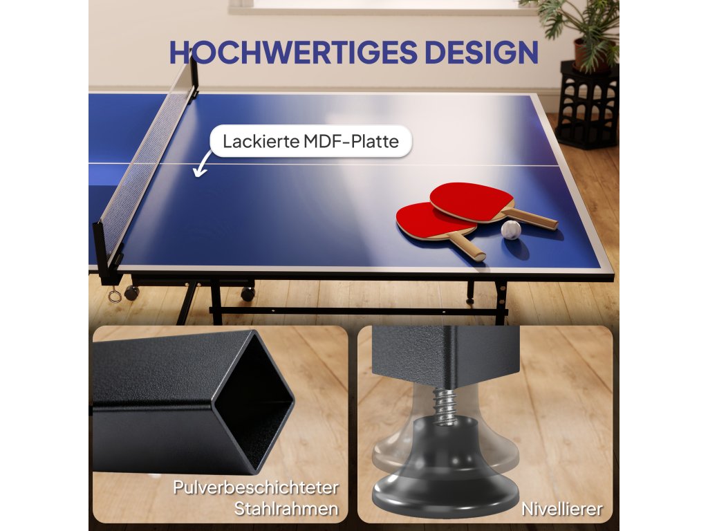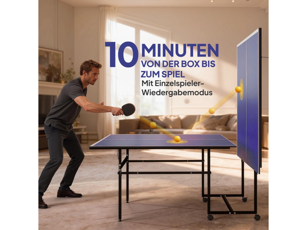 - Prostorově úsporný design: Možnost složit obě poloviny stolu opět výrazně snižuje potřebu úložného prostoru v porovnání s běžnými stoly na stolní tenis, takže tento stůl na stolní tenis je ideální pro hráče, kteří jsou nároční na prostor