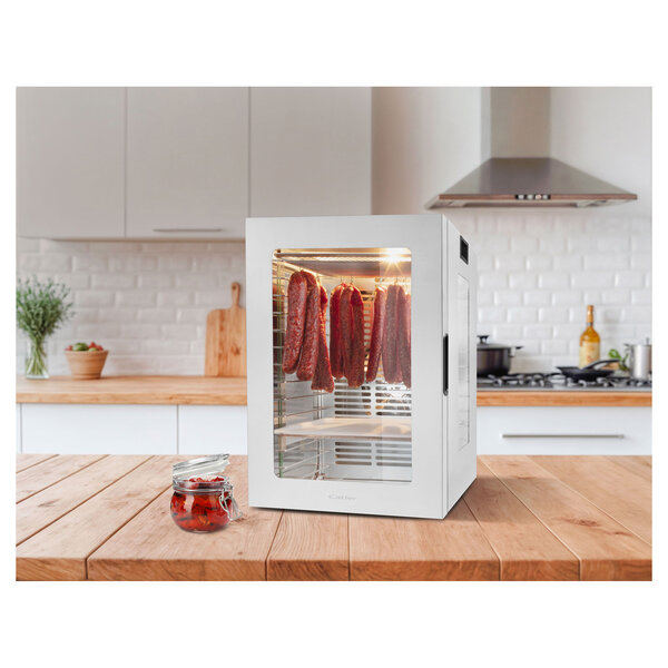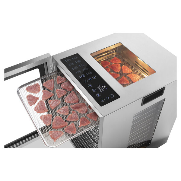 Sušička potravin FD 4012 vyniká profesionálním vzhledem, ale i funkční výbavou: je nerezový uvnitř i vně, kompletně bez plastů, má kvalitní dílenské zpracování, sušicí plata snadno vytáhnete a neposlední řadě má skleněné průhledy ze všech stran, abyste viděli dovnitř. Ovládání je plně dotykové, k dispozici je vnitřní světlo, teplotní rozsah 35–75 °C a sušení až po dobu 48 hodin. Díky 10 automatickým programům připravíte nejen sušené ovoce, ale i ovocné plátky, domácí müsli, semínkové krekry nebo sušené maso – protein do kapsy. A pokud rádi experimentujete, sušička umí i domácí klobásky, stačí zavěsit!Vlastnosti sušičky potravin