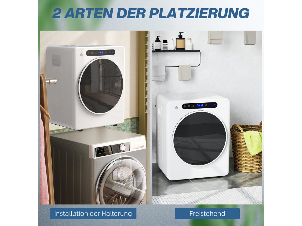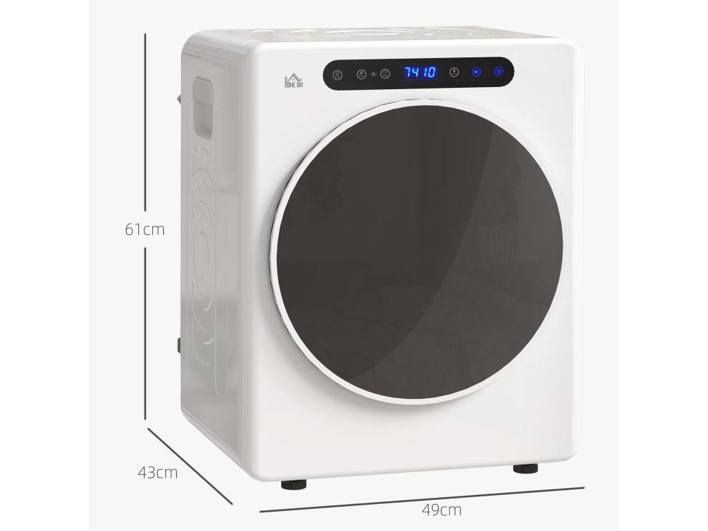 Tato kompaktní sušička prádla HOMCOM s motorem o výkonu 1000 W je ideální pro malé prostory. Usuší až 3 kg mokrého prádla a lze ji nastavit v rozmezí 40–60 °C pro šetrné sušení prádla. Díky funkcím mini sušičky, jako je Extra Dry a Smart Auto Adjust, zaručuje optimální výsledky. Lze ji použít volně stojící nebo namontovat na zeď.