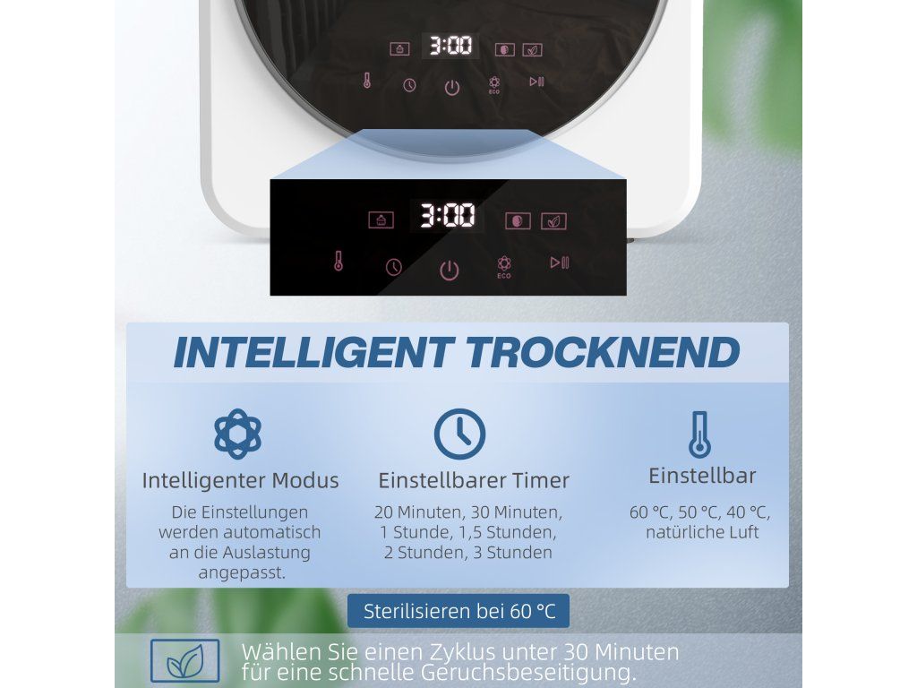 Dotykový displej: Dotykový digitální displej této přenosné sušičky s odvětráváním zobrazuje zbývající dobu sušení a teplotu. Pro větší bezpečnost je spotřebič vybaven funkcí automatického vypnutí.