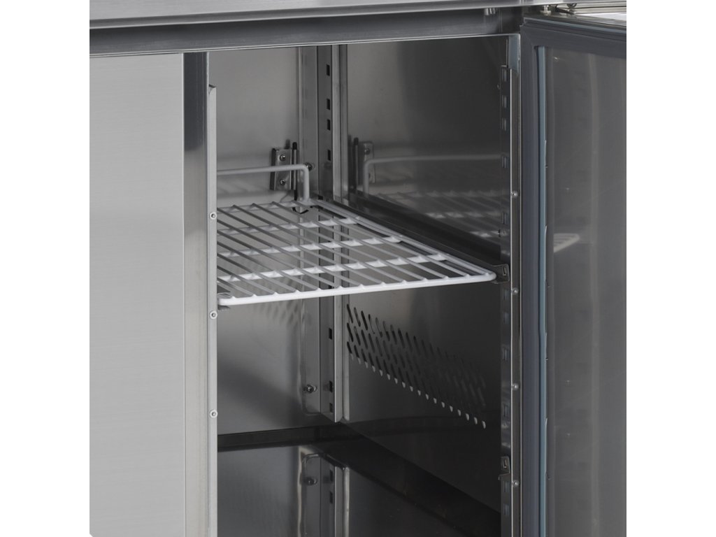 Tyto mrazicí nerezové stoly se dodávají standardně bez desky, která lze dokoupit na objednávku s lemem nebo bez lemu. Agregát je rovněž možné zvolit na pravé nebo levé straně. Stůl má samozavírací dveře. Tyto stoly jsou k dispozici také v chladicí verzi. NA OBJEDNÁVKU • pracovní deska bez lemu - výška 40 mm • pracovní deska s lemem - výška 40 mm, zadní lem 40 mm • nerezový držák roštu (pár) • roštventilované chlazení, automatické odtávání, digitální termostat, digitální ukazatel teploty, agregát vlevo, kompletní nerezové provedení, nastavitelné police, samozavírací dveře, nastavitelné nožky